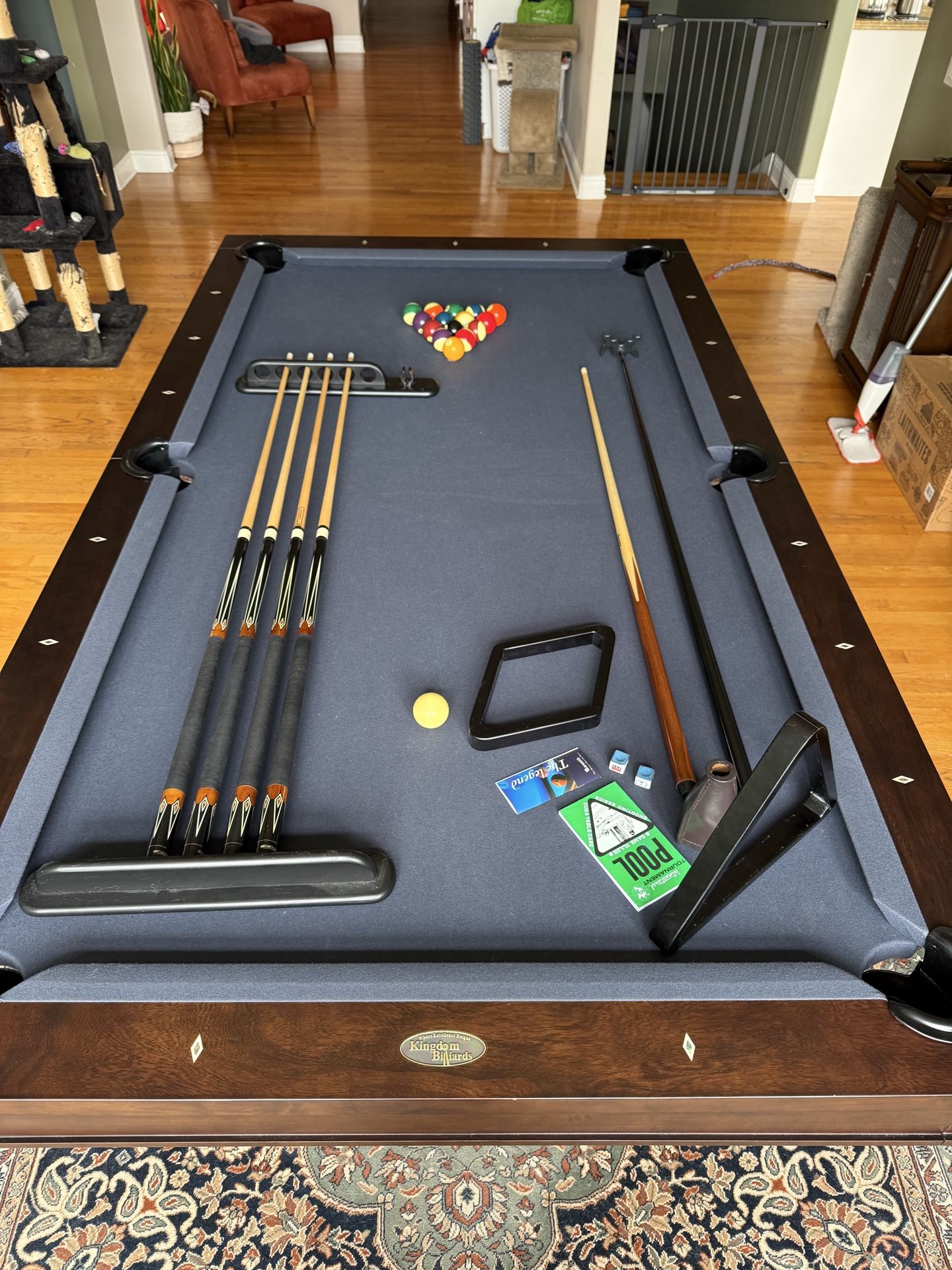 Custom King James Pool Table w/ Dining Top & Bench It's only a few years old & it took a couple months to have made & delivered to us! Exactly like this: https://offerup.com/redirect/?o=aHR0cHM6Ly9raW5nZG9tYmlsbGlhcmRzLmNvbS9raW5nLWphbWVzLTE= Selling a custom-built King James pool table with titanium felt, matching dining conversion top, and bench. Also includes a platinum accessory kit (cues, balls, rack, etc.). Originally $6,500 MSRP + tax & delivery. PRISTINE condition and a great centerpiece for a game room or dining/game combo space. • Custom King James table • Titanium felt • Dining top included • Matching bench • Platinum accessory kit • Solid high-end construction Price: $5,900 OBO Buyer responsible for moving. Message me ONLY if seriously interested OR send phone number for faster response & happy to call or text you a video of the pool table since I can't post a video on here We are only selling as we are moving & need to lighten our move. I'm waiting to hear from serious buyers & will NOT entertain low ball offers. We are patient & willing to wait for the right buyer or we will just take with us to our new home. Description as follows: 8 Feet Long • Maple Wood • Midnight Stain • Arch Pedestal Legs * High-Grade Maple Construction – Cabinet/Legs/Rails/Support Beams. * 4 Stage Automated Kiln Drying Process. * Spray & Hand Rubbed Oil Based Stain * Wide-Profile Rails. * Recessed Maple Sub Rails. * Durable and Perfectly Jointed Blinds. * Genuine Abalone in Mother-Of-Peal Pre-Finished Double-Diamond Sites. * High Torque, Fixed Nut-Plate Rail Design. * Breathable, K-66 Full Profile, Gum Rubber Cushions With Vulcanized Control Panel. * 1” Oversized Matched & Registered Slate. * Heavy Duty Precision Corner Brackets. * Pre-Leveled Cabinets. * Lag Bolt/Barrel-Insert Design To Anchor The Corner Brackets To The Cabinet (Some Models). * Triple-Anchor Leg Supports (Some Models). * Double-Interlocking Mortis Cut Solid Maple Support Beams. * Barrier Lock, Maple Cross Beams, Interior Cabinet and Leg Supports are stained and sealed. * All Leather Pockets w/Stylish Accented Fronts & Cast Iron Cores. * Lag Bolt Insert Leg Attachment Design. * Beautiful Poly Urethane Finish with Rich Satin Look. * BCA approved for Tournament Play. * Cross-Laminated Handcrafted Legs.