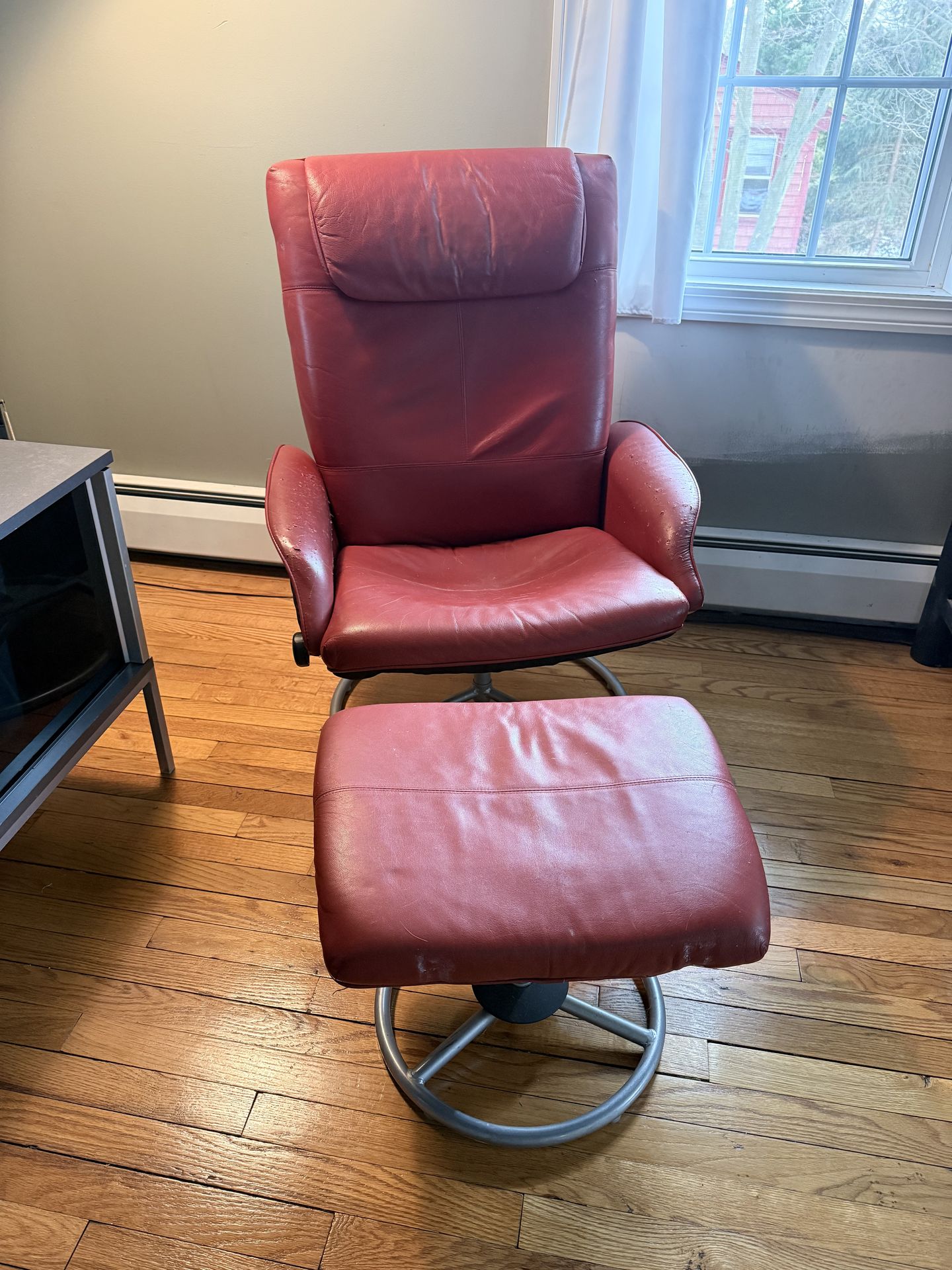 Red Leather Recliner and Footstool