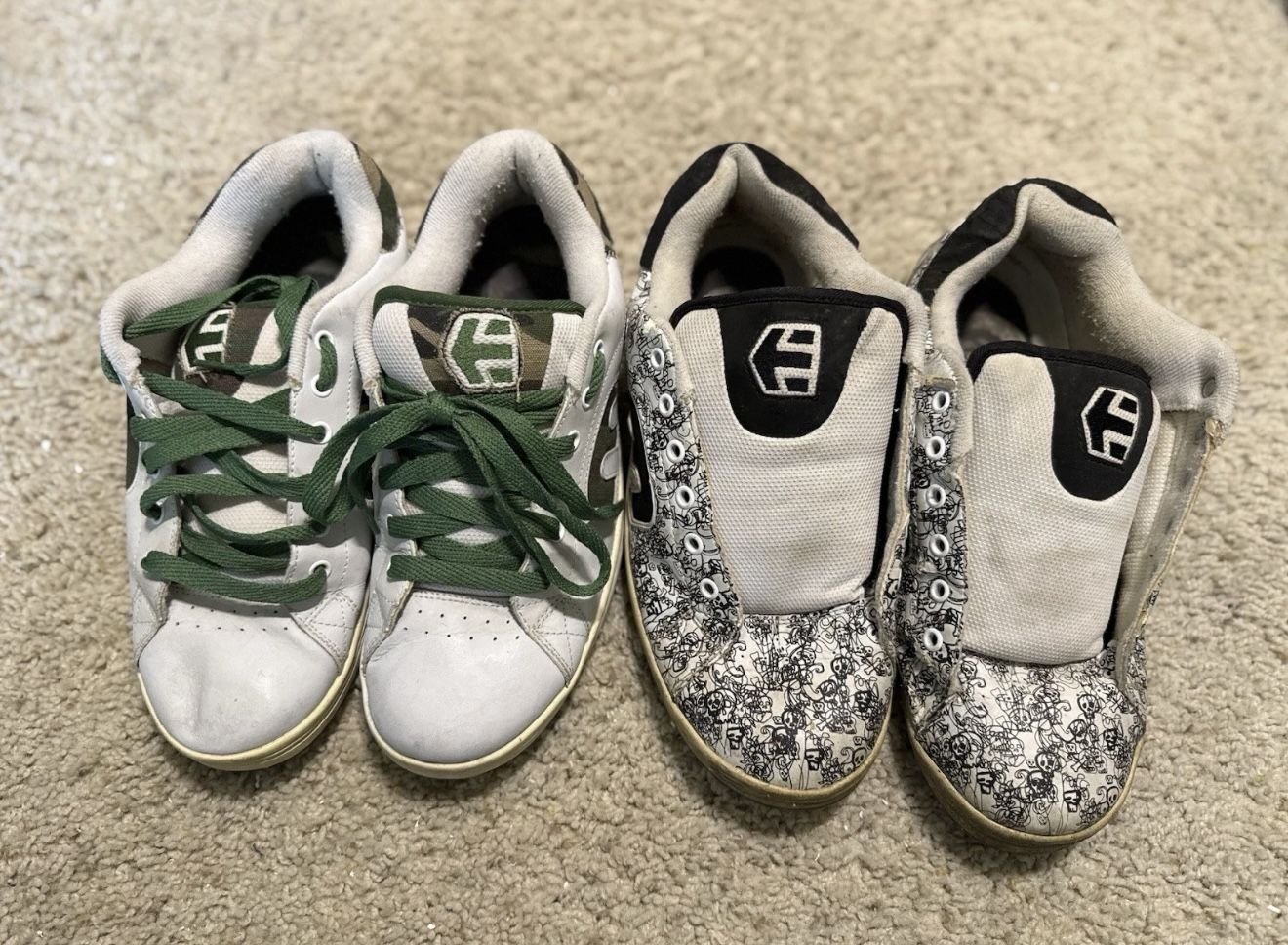 Bring classic Y2K skate style to your collection with this pair lot of men’s Etnies Calliout sneakers, size US 10 / EU 43. 🟢 1) White/Green Camo with laces • Iconic Etnies logo on tongue & side • Green camo textile details • Pre-owned, used condition: visible wear, light marks, slight discoloration. • Still wearable, soles intact. ⚪ 2) White/Black Graphic Slip-On style (without laces) • All-over doodle-style graphic • Tongue logo • No laces included • Worn condition: more significant signs of use, discoloration, wear around edges. • For restoration, skating practice or display. 📐 Size: • US 10 • UK 9 • EU 43 • JP 28.0 cm 🔍 Condition: Both pairs are used with age-related wear. Selling AS IS – for collectors, restoration, or skate practice. Please review all photos carefully before purchase. 🎯 Features: • Authentic Etnies sneakers • Iconic skateboarding brand • 2000s / Y2K skate style • One lace-up + one slip-on pair • Ideal for skaters, vintage sneaker collectors, or DIY customization