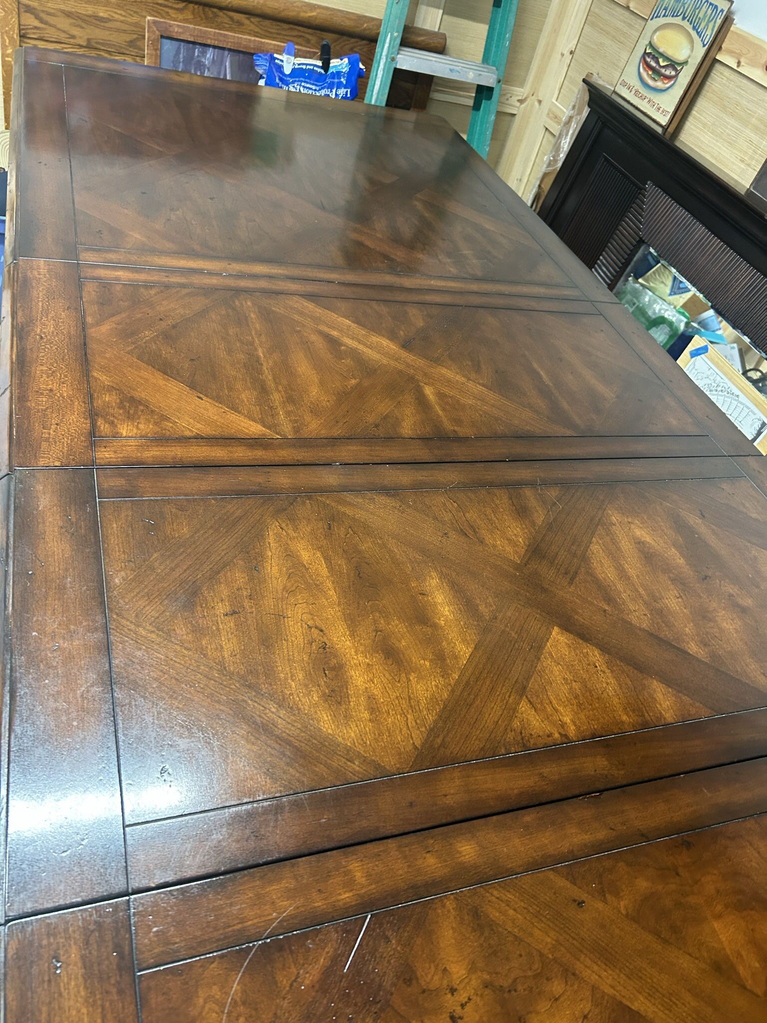 Beautiful dining room table. 6 ft 9 in long or 9 ft 9 in long with two 18 in leafs. 44 in wide. Comes with 6 chairs, two with arms.