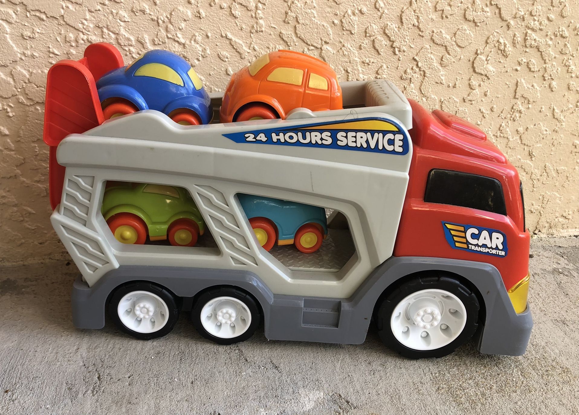 Perfect condition. Four little cars included Size of truck :15 inches long x 9 inches tall Size of cars inside: 4 1/2 long x 3 inches tall