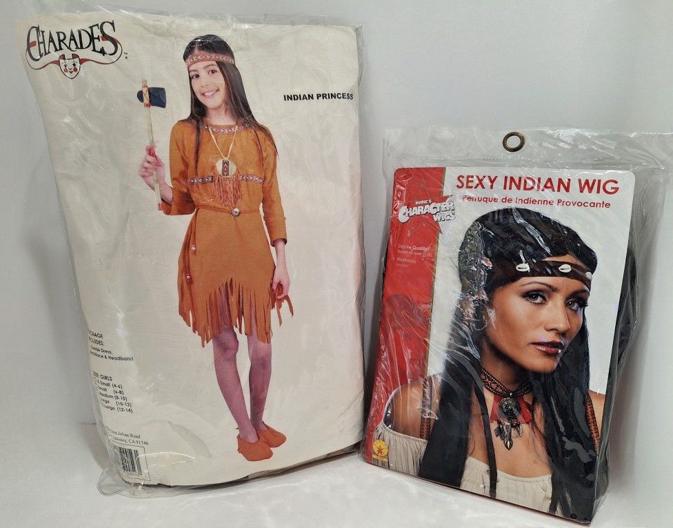 This Indian Princess dress is by Charades and the Indian wig is by Rubie's Character Wigs. The dress is tan, long sleeve, and faux suede with a fringe hemline. The headband has a decorative pattern on it and the necklace has fringe and a large pendant. The wig is a deluxe, washable wig. It is long, black, and comes with a headband that has real shells and a feather. •Dress Size: X-Large (12-14) •Wig Size: O/S