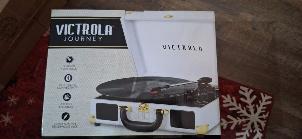 This is a new Victrola Record player with Bluetooth. It is white color. Has never been opened. The box does have a tear in it but the record player is good without dents or anything.