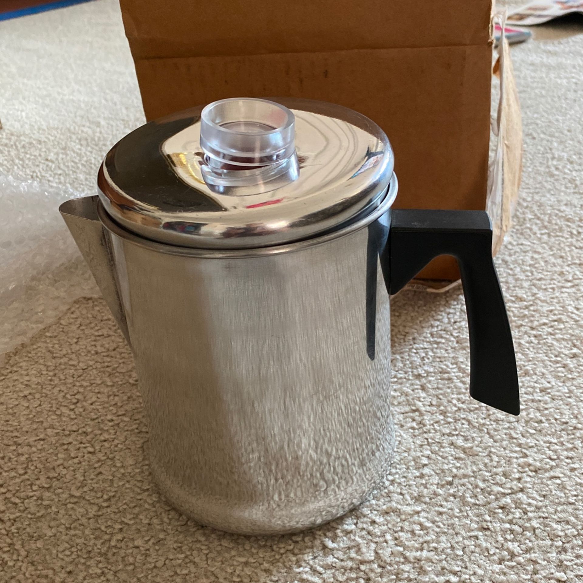 Good for camping, 4 cup percolator, new never used in box. Please see other posts