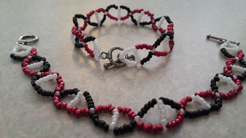 These bracelets are all hand beaded by me. They come in my own unique wave DNA pattern. Two are currently available in the red, black, and white combination. Approximately 7" long with toggle closure. Asking $10 each. I will give a discount for multiple purchases. If you would like one in custom colors, pick up to 3 colors for one bracelet. Please send me a message.