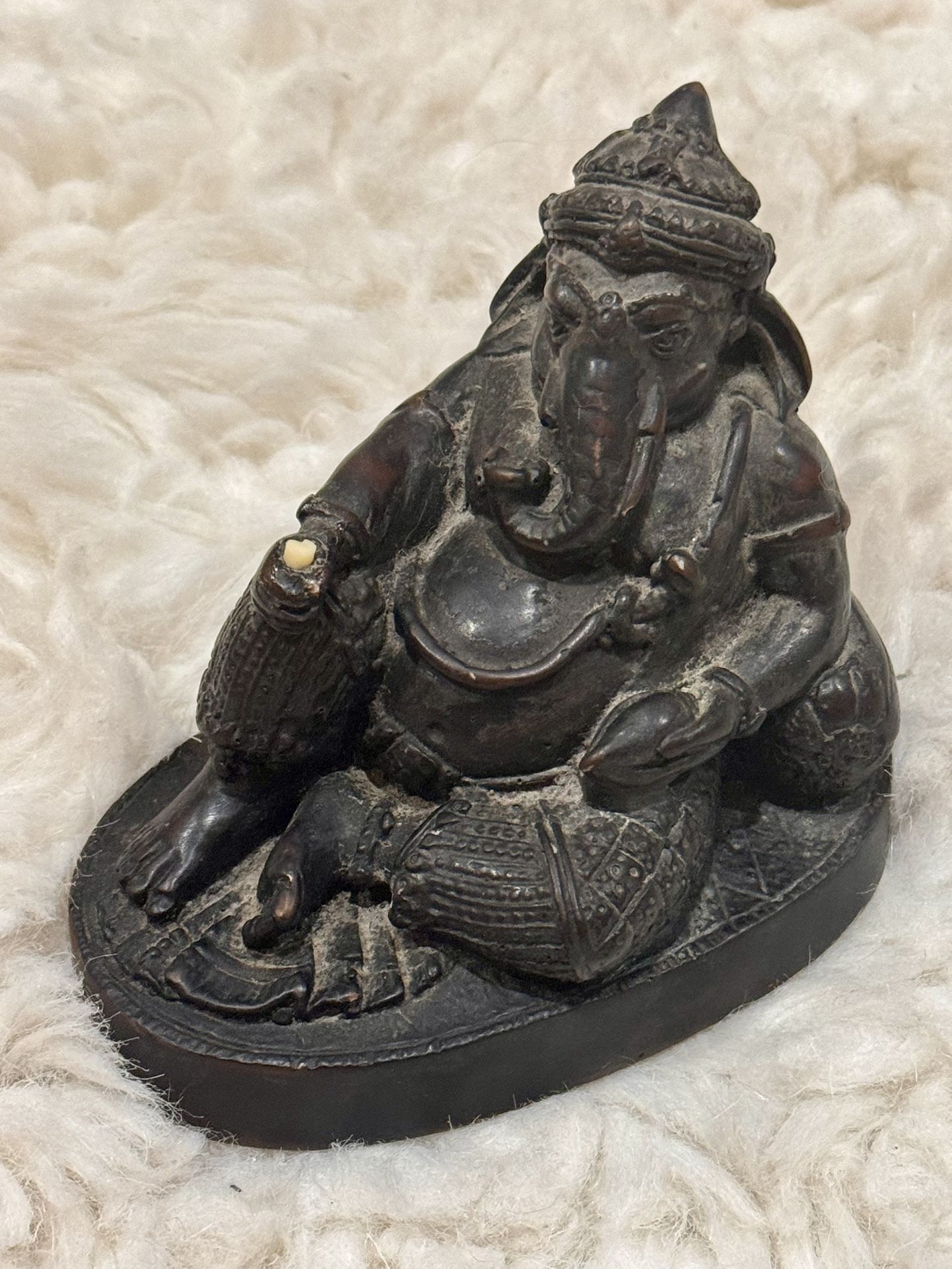 Moving out of the country. Check my other listings — Selling everything in my house. Venmo/PayPal/Zelle or cash only. No echecks, money orders, cashiers checks or any other forms of payment accepted. — Vintage bronze resin sculpture of the Hindu deity Ganesha, depicted seated in a relaxed pose and finished with a dark patina. Dimensions: 5” wide x 4” tall x 3” deep - **Deity**: Ganesha, the remover of obstacles and lord of beginnings. - **Pose**: Seated in royal ease with one knee raised, commonly known as *Khmer-style* or *votive figure*. - **Attributes**: Holds a symbolic implement in one hand, often interpreted as a broken tusk or a sweet, symbolizing wisdom and abundance. - **Material**: Hand-cast bronze, often appearing in antique or vintage collection