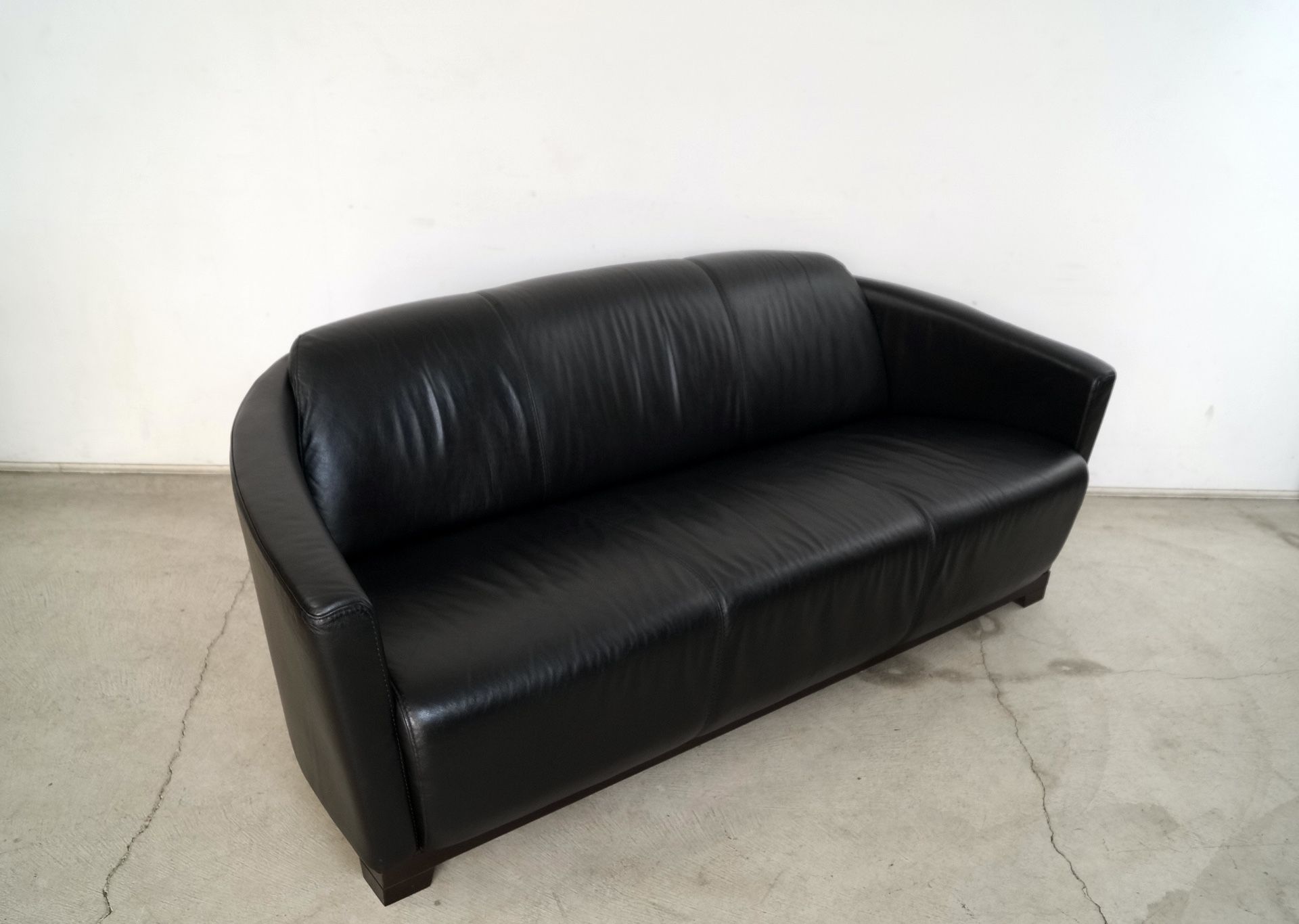 Post modern couch for sale. Manufactured by Calia Italia, and made in Italy. It's in great condition, and has an Art Deco design and style. It's made of black leather, and is a 3-seater couch. It has a solid wood base frame with Art Deco lines, and is a dark wood finish and tone. It's very well made and solid, and very comfortable. The leather has been cleaned, polished, and conditioned and is in beautiful condition. The wood base is also in great condition. It has the tag underneath. This piece would work with vintage or contemporary. It's a great size with great curves and lines. The measurements are 73" long x 28" tall x 34" deep x 17 1/4" seat height. Delivery can be arranged. Please check my other listings! π Mcm mid century mid-century danish modern midcentury hollywood regency