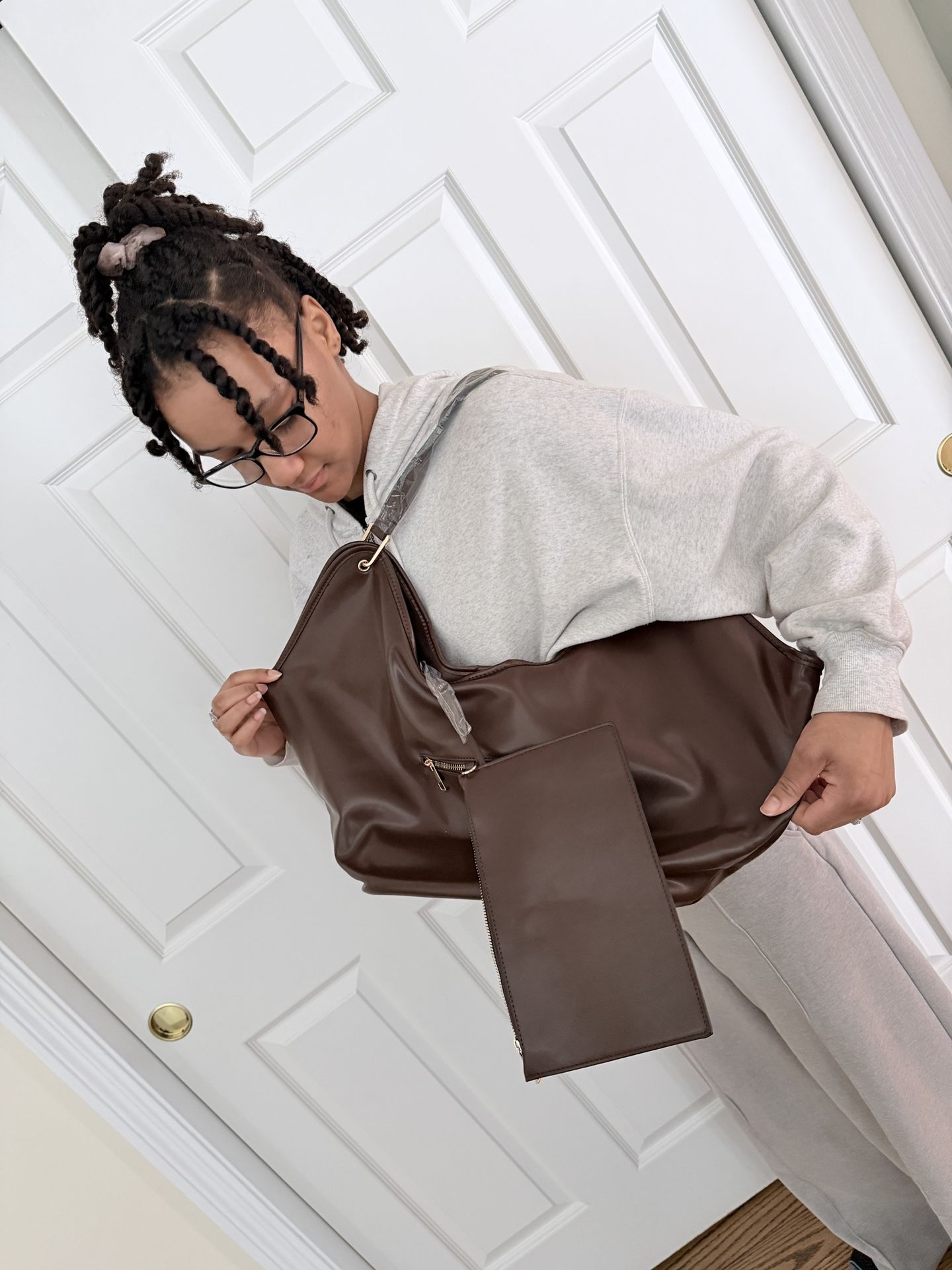 Large spacious two piece bag with a matching makeup pouch that is detachable. It has gold hardware and great as a weekender.