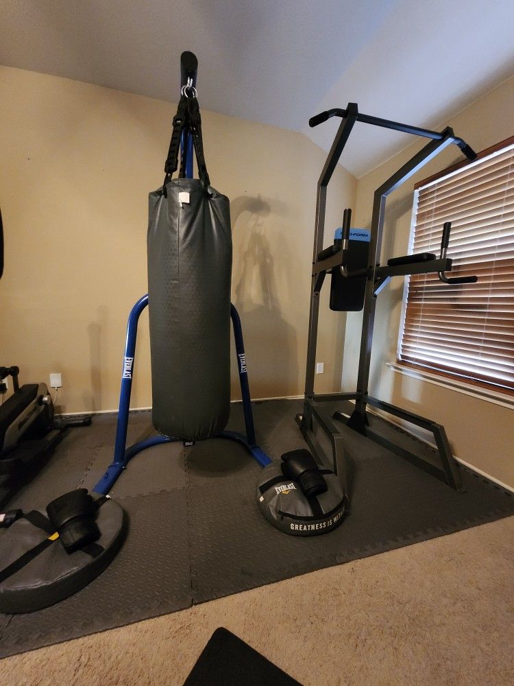 Includes: heavy bag(punching bag and stand). PowerTower(abs, dips, and pullup workout)