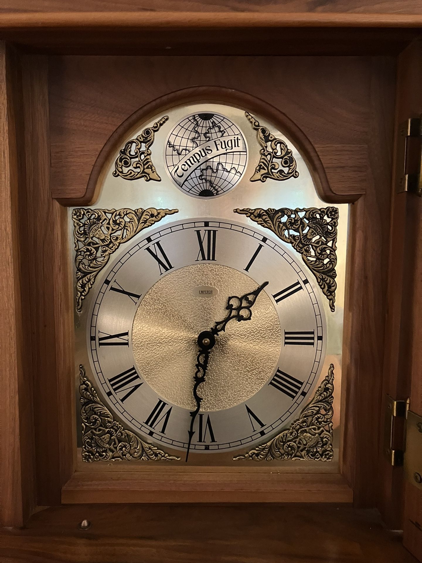 Emporer Tempus Fugit grandfather clock. Has worked in the past, not currently running (haven’t been winding it). I believe the weights need to be balanced.