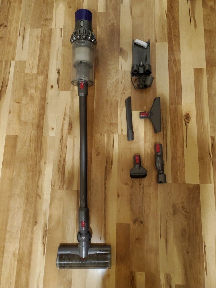We recently upgraded to a newer Dyson and no longer need this one. Works great and is excellent for pet hair. Comes with pictured attachments, charger, and wall mount with screws and anchors. There are a few small cracks in the handle area (see pictures) and the red piece that helps connect the tube to the upper part of the vacuum needs to be reattached. Vacuum can still be put together and none of these affect is functionality. $60 obo cash only If you are seeing this ad, it is still available.