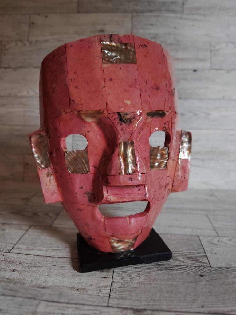 This mask sculpture is absolutely stunning! The beautiful shade of pink is so striking & the abalone just takes it to the next level. An amazing pop of color in any room, it nods to a culture rooted in tradition & reverence. How amazing would it look on a shelf in a home library?! MEASUREMENTS: 8.5" tall, 7" wide Item weight: 1 lb. 8 oz. CONDITION: Great condition. No cracks or repairs. The back side of the mask appears to have a chip or two and some areas may just be where the paint was missed. The black stand has some missing paint which could be repainted. Please view all photos listed which include measurements, and be sure to check out my other listings for more great items!