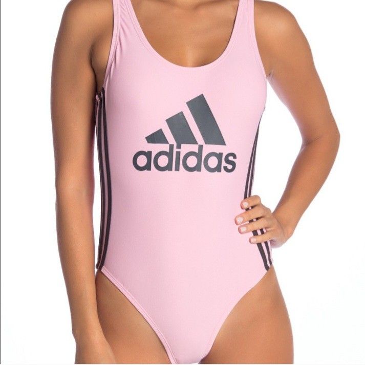 New with tags Adidas one-piece swimsuit with a low cutout back. Solid pink with grey Adidas logo front center and 3-stripe sides. Nylon and spandex with polyester lining. No damage or defects. Smoke and pet free home.