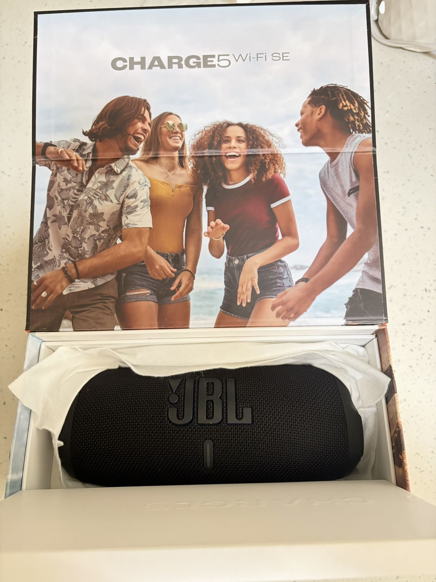 Powerful JBL Charge 5 Wi-Fi SE speaker. Still in original box, never used. Black color. Has Wi-Fi and Bluetooth connectivity. Works with Apple AirPlay, Spotify, Google Cast, Google Home, and Alexa. Up to 20 hours battery life. Great sound for home or on the go. Pickup escondido ca 92026, can deliver locally for $$ extra