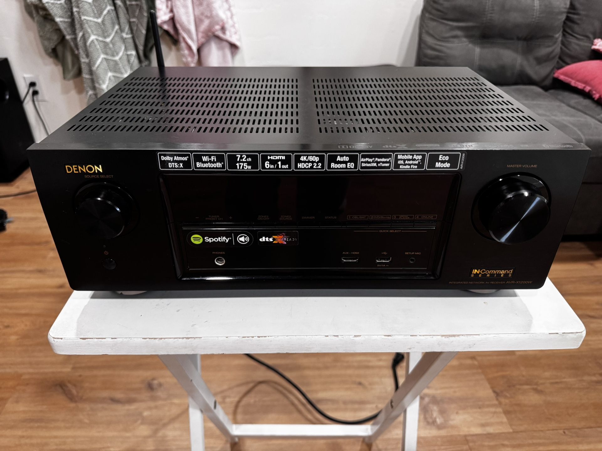 Selling my Denon AVR-X1200W from the In-Command series. The unit is in excellent cosmetic and overall working condition and has been well-taken care of. It delivers great sound quality and supports modern home theater features including 7.2 channels, 4K Ultra HD passthrough, Dolby Atmos, built-in Wi-Fi, Bluetooth, and plenty of HDMI inputs. Important Notes (Full Transparency): • The subwoofer pre-out(s) are not working, so it will need repair if you plan to run a subwoofer through the receiver. • Remote is not included, but the free Denon Remote App works great for control, and universal remotes are compatible. Features: • 7.2-channel AV receiver • 80W per channel (8 ohms) • Dolby Atmos & DTS-HD support • 4K/60Hz, HDR, HDCP 2.2 compatible • 6 HDMI inputs / 1 HDMI output • Wi-Fi, Bluetooth, and AirPlay • Audyssey MultEQ room calibration • Clean front panel and all other inputs/outputs functioning Perfect for someone who doesn’t need a sub output or knows how to fix it. Still a solid receiver for music and movies.