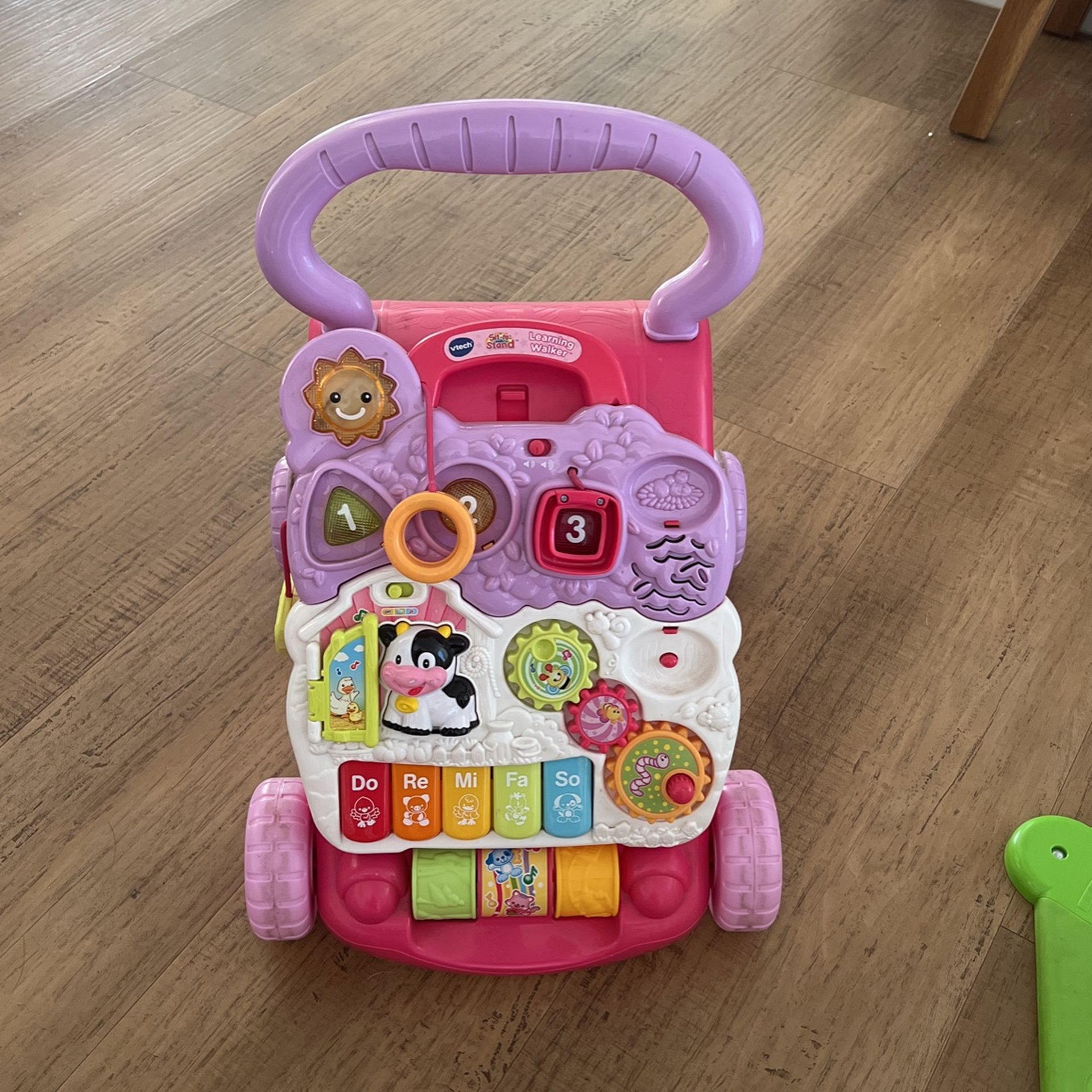 Sells for $58 on https://offerup.com/redirect/?o=V2FsbWFydC5jb20=. You can have it for $30. From baby steps to big steps the Sit-to-Stand Learning Walker by VTech helps your baby develop from a crawler to a walker through adaptive technology. With a barnyard of playful friends to cheer them on, your little one will have endless fun as they learn to walk. Start out with the easy-to-remove activity panel for floor play or on-the-run fun, then step it up with the fun-to-maneuver walker. Spinning gears, five piano keys, three colorful rollers, three light-up shape sorters, three light-up buttons and a telephone handset offers endless fun that will stimulate your baby's learning and develop their motor skills. The Sit-to-Stand Learning Walker keeps baby on track teaching shapes, colors, animals, music and more! Interactive learning baby Walker has a removable play panel; frustration free packaging means it comes in a plain brown boxEarly learning center has 5 piano keys that play music and encourage creativity; wheels work on carpeted and hard floorsFeatures 2 colorful spinning rollers, 3 shape sorters, and 3 light-up buttons that develop motor skillsPretend telephone handset and mechanical elements enhance role-play fun; 2 AA batteries are includedOver 70 sing-along songs, music, sound effects and fun phrases; meant for babies and toddlers 9 months to 3 years old