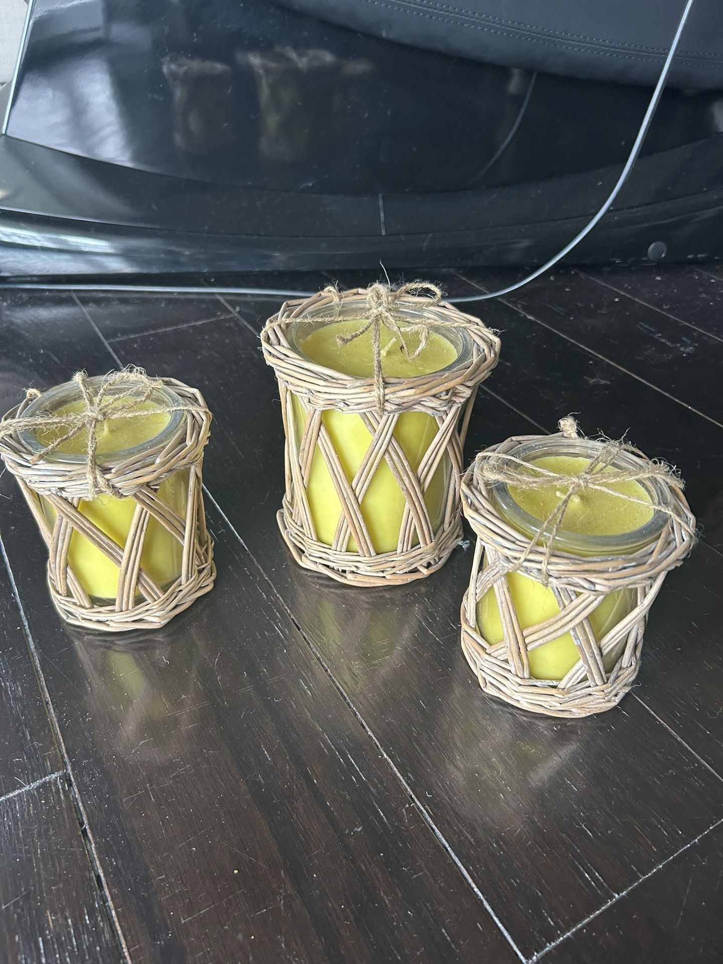 Set of three decorative glass candles wrapped in woven rattan-style holders. Green candles inside clear glass, each tied with rustic twine. All are unused and in excellent condition. Perfect for home decor, table centerpieces, shelves, or outdoor/boho-style spaces. Neutral, natural look that fits farmhouse, coastal, or modern decor.