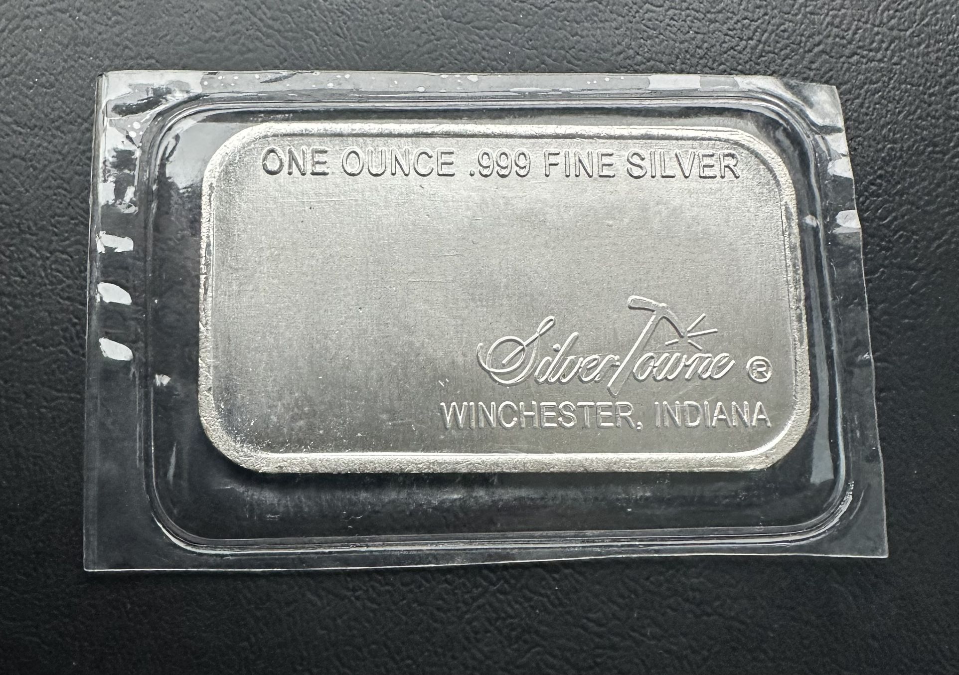 This is a 1 oz SilverTowne Prospector silver bullion bar (also commonly called the “Prospector and Donkey” or “Donkey Bar”), privately minted by the SilverTowne Mint in Winchester, Indiana. The design features SilverTowne’s iconic trademark image: a bearded prospector (often nicknamed “Pete”) walking while leading his heavily loaded pack donkey (or mule/burro) with a rope in one hand and a pickaxe in the other. The detailed packs on the donkey include tools like a shovel, gold pan, and supplies—evoking the classic American Old West gold rush era. This horizontal “retro” or vintage-style layout is one of the most recognizable and enduring designs in private silver bullion, produced since the 1970s/1980s with minor variations over time. It’s made of 1 troy ounce of .999 fine silver, still in its original sealed plastic packaging for protection. The reverse (not shown) typically features a repeating waffle/crisscross pattern with the SilverTowne logo and repeated prospector motif in the center, along with weight and purity markings. SilverTowne’s Prospector series is hugely popular among stackers and collectors for its nostalgic appeal, quality, and low premiums—often nicknamed “donkey bars” in the community.