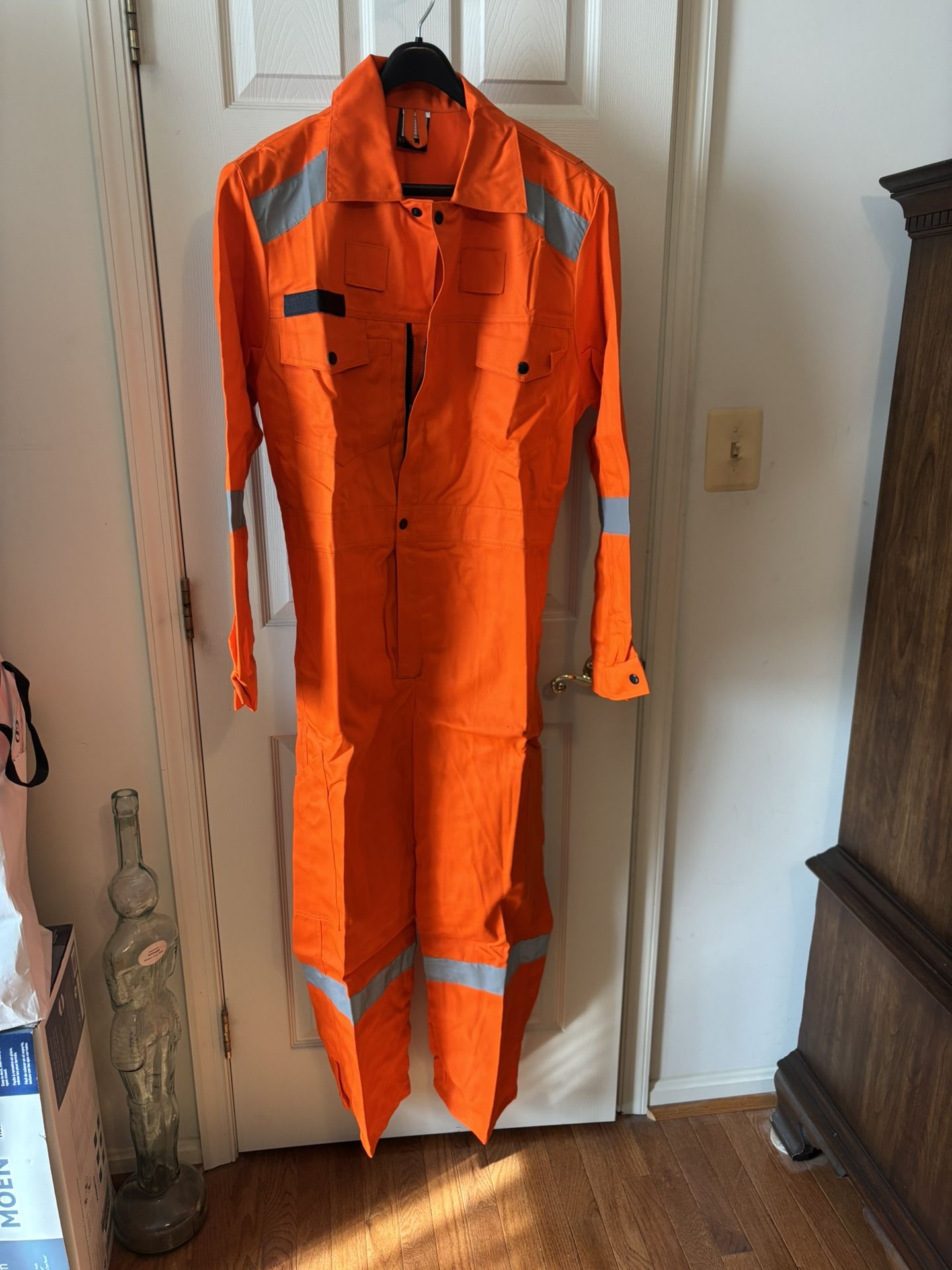 UPDATED 04 AUGUST PRICE REDUCED Two NEW, never worn, work overalls. International orange with reflective tape on back, sleeves and legs. Large snap pockets on the front, deep front and rear pockets and flashlight pocket on legs. Zippered front. Antiflame. Very durable. Size medium, European 170-176 x 88-92. I am 5’09” at 165#. These are slightly loose on me. Excellent for winter work with a sweat shirt underneath. $30 each.