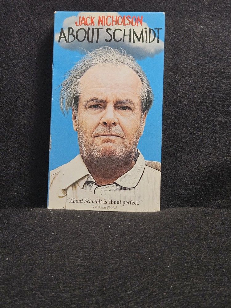 About Schmidt with Jack Nicholson. Is about a retired person whose daughter is about to marry someone that's questionable. He takes it on himself to meet the groom's parents and investigate the entire affair. This movie does have a happy ending. Jack Nicholson is as you normally is a little strange. This is the original release and is in VHS format