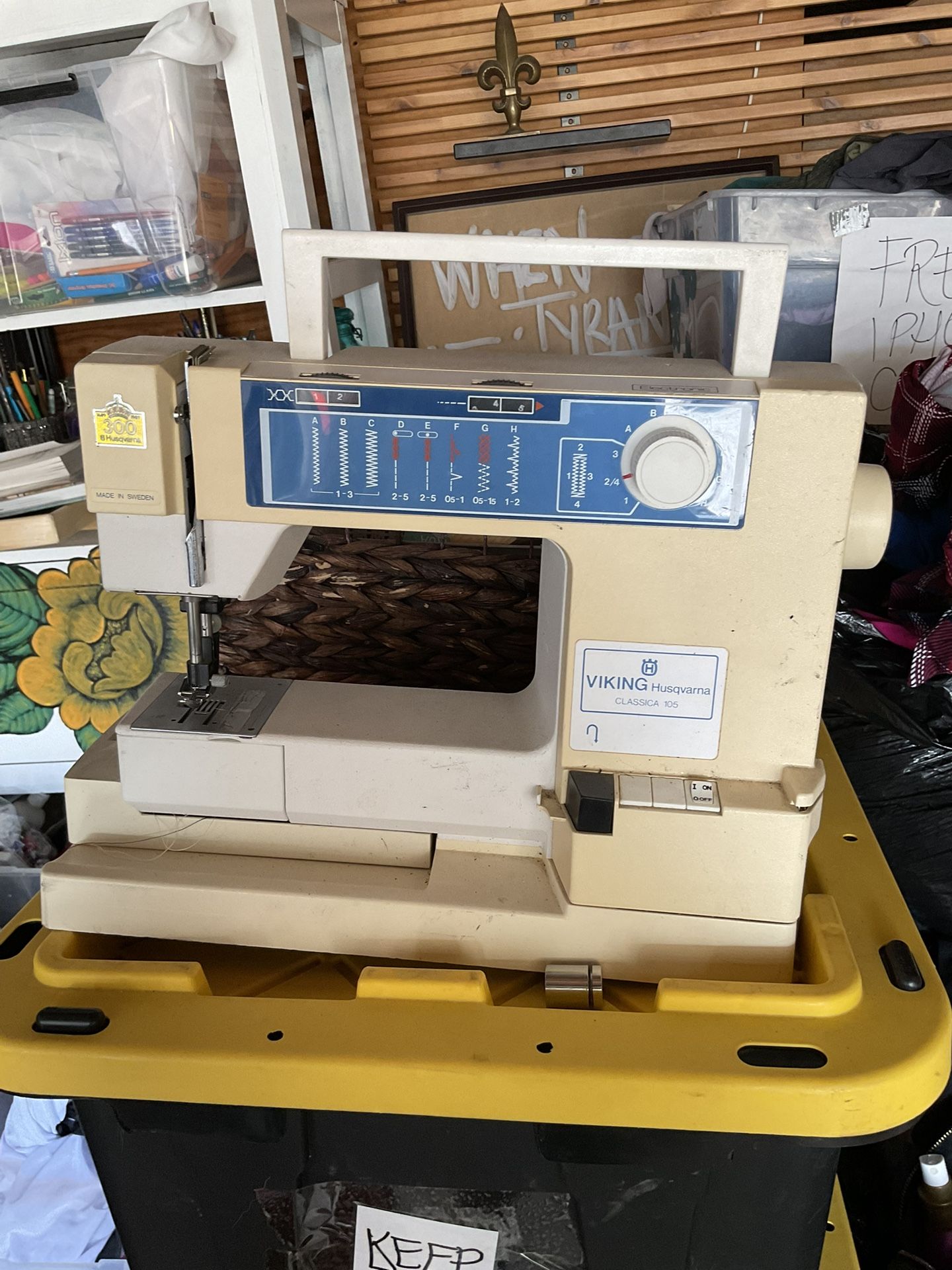 Viking Husqvarna Classica 105 sewing machine. It is a vintage model manufactured by Husqvarna Viking, likely in Sweden. It is a mechanical sewing machine known for its durability and suitability for general sewing and quilting. The machine features several built-in stitch patterns, which are selected via the dial on the front panel.