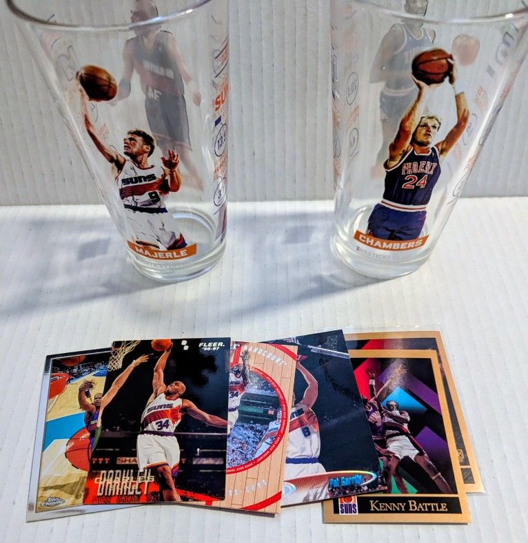 These are (2) Vintage Arizona Suns Pint glasses. Featuring Barkley, Majerle, Chambers, and Davis . PLUS some Suns Trading cards to go with them. Pick up in Scottsdale AZ