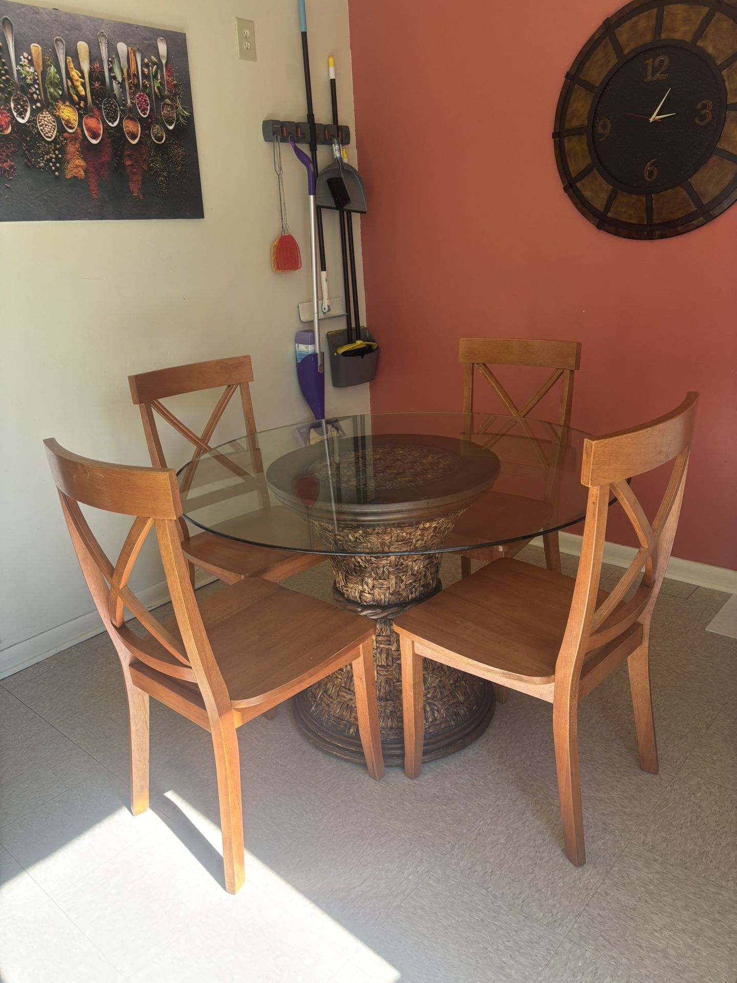Glass top is in perfect condition. The base is strong. Chairs are included for an additional $60