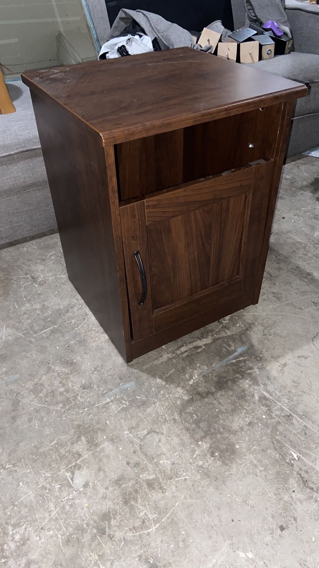Nightstand Back panel has angled opening for charging cables or cords to go through. Door needs to just have a new screw installed/hinge repaired Still opens and closes just fine