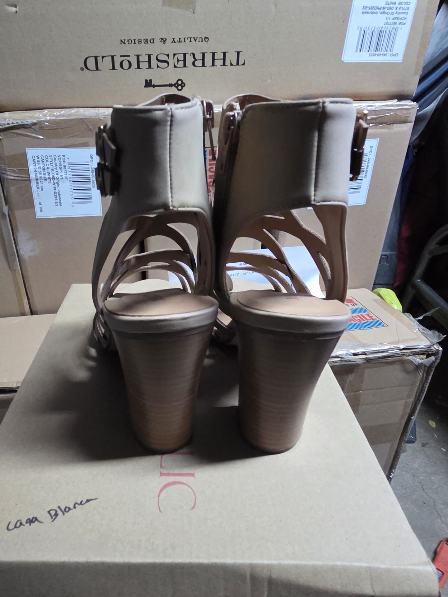 Tan Platform High Heel Sandals – Strappy Ankle Design Step out in style with these stunning black platform high heel sandals. Designed with a sleek open-toe front and secure crisscross ankle straps, these heels combine elegance with bold fashion. The chunky platform and sturdy block heel provide added height while maintaining comfort and stability. ✨ Features: Classic tan brown finish – easy to match with any outfit Open-toe platform design Adjustable ankle strap with buckle closure Thick block heel for better balance Fashion-forward strappy detail Perfect for parties, nights out, events, or dress occasions 📦 Condition: New / unused (with original packing inserts) 👠 Style: Platform high heel sandal 🎯 Great for: Dresses, jeans, formal wear, or nightlife looks Add a modern statement piece to your wardrobe with these versatile and stylish heels. Size 10