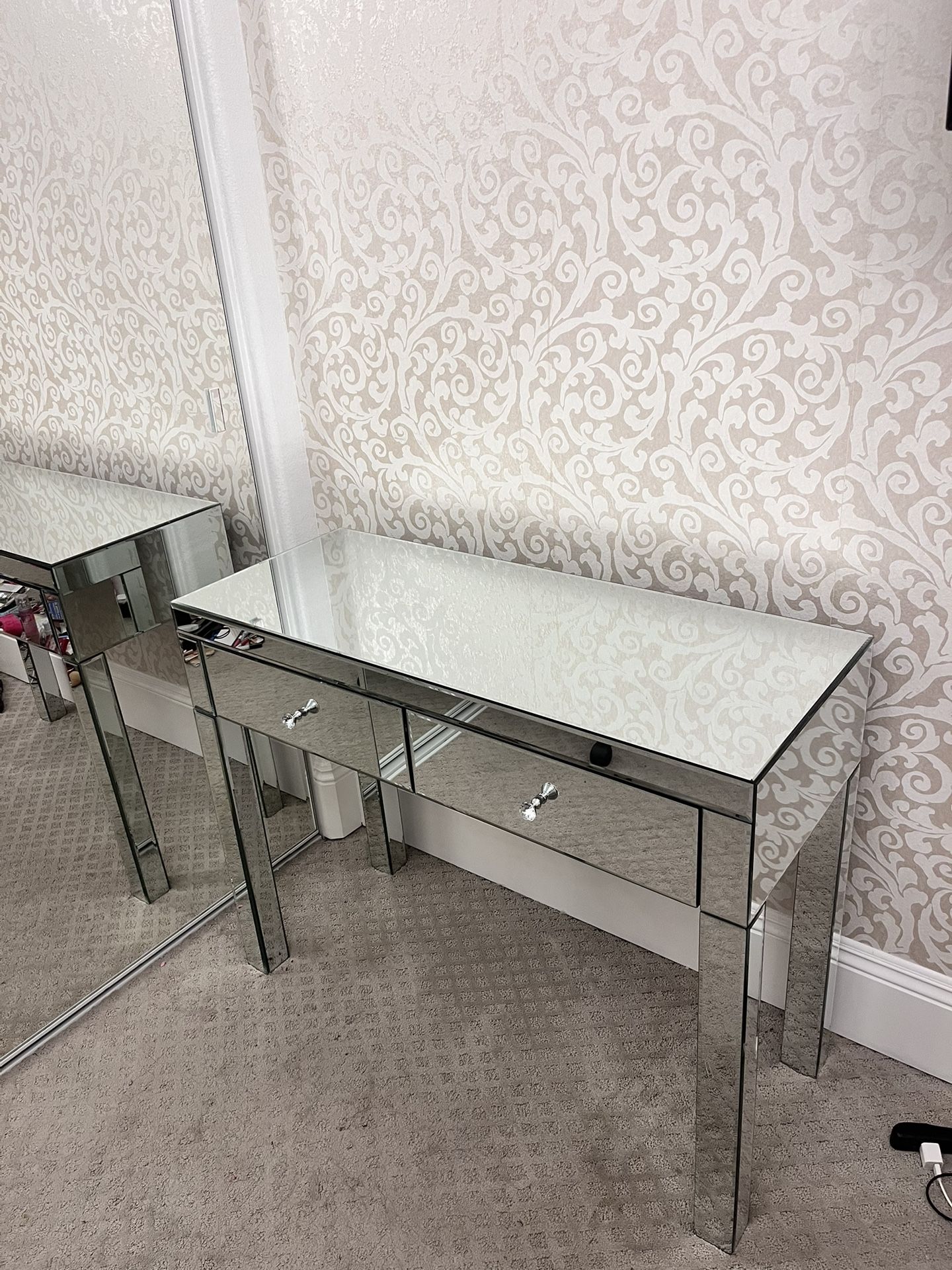 Selling my mirrored vanity desk. 16 inch x 40 inch x 31 inch tall nothing wrong with it, in great condition moving and just don’t need it anymore.