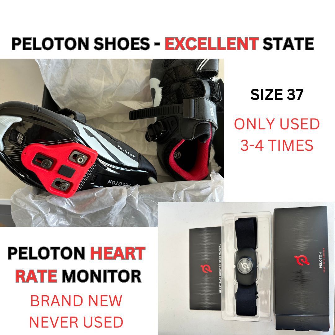 Size 37 Peloton Shoes in excellent condition, no wear and tear. Only used 3-4 times. Heart Rate Monitor is still in the box, never used.