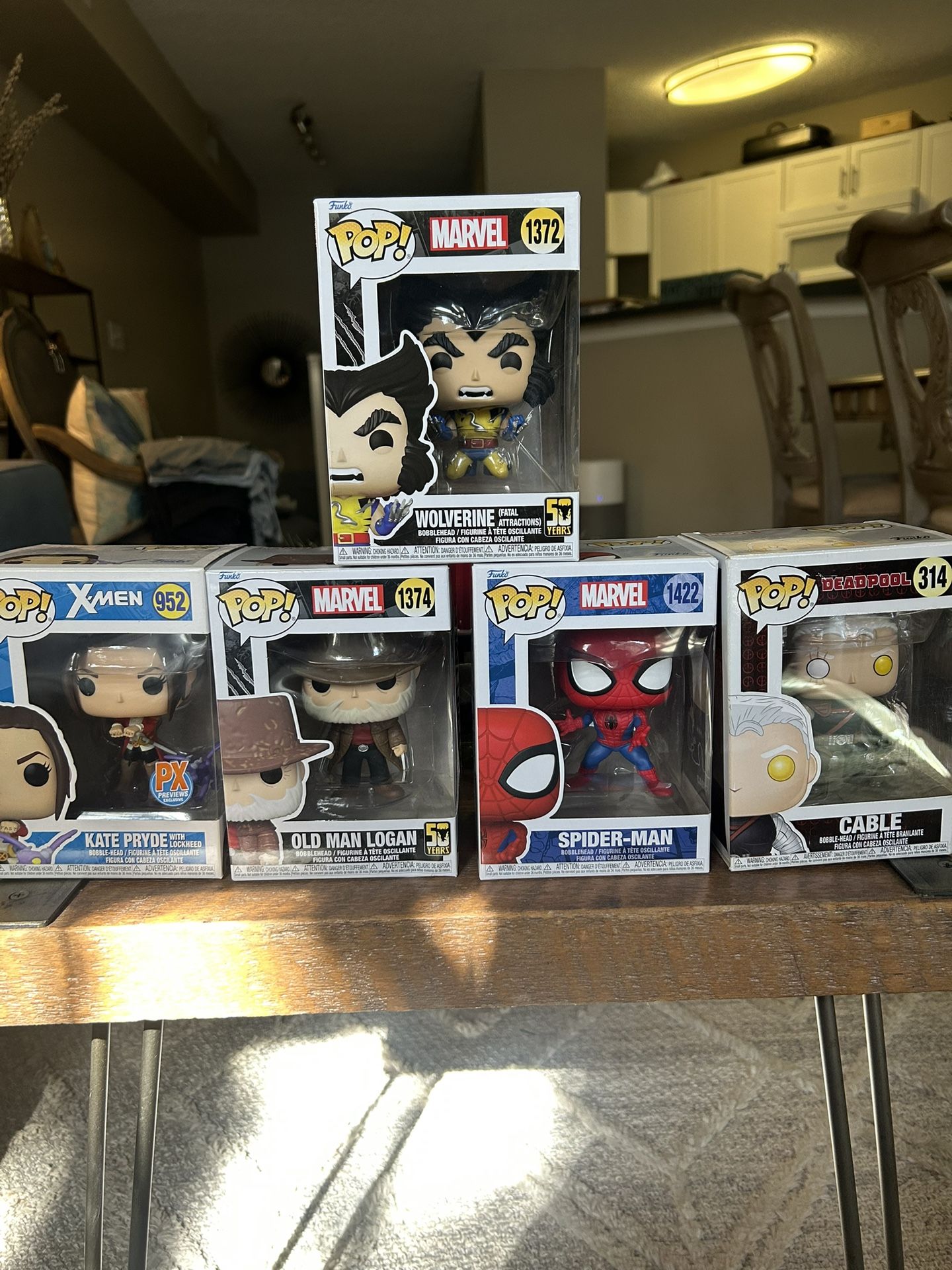 All brand new in boxes, Marvel/X-Men Funko Pops: 1372 Wolverine (Fatal Attractions) 314 Cable (Deadpool movie) 1422 Spider-Man 1374 Old Man Logan (50 year Wolverine anniversary) 952 Kate Pryde (with Lockheed dragon) pirate costume Perfect for Christmas gifts/stocking stuffers Pick up in Boynton Beach