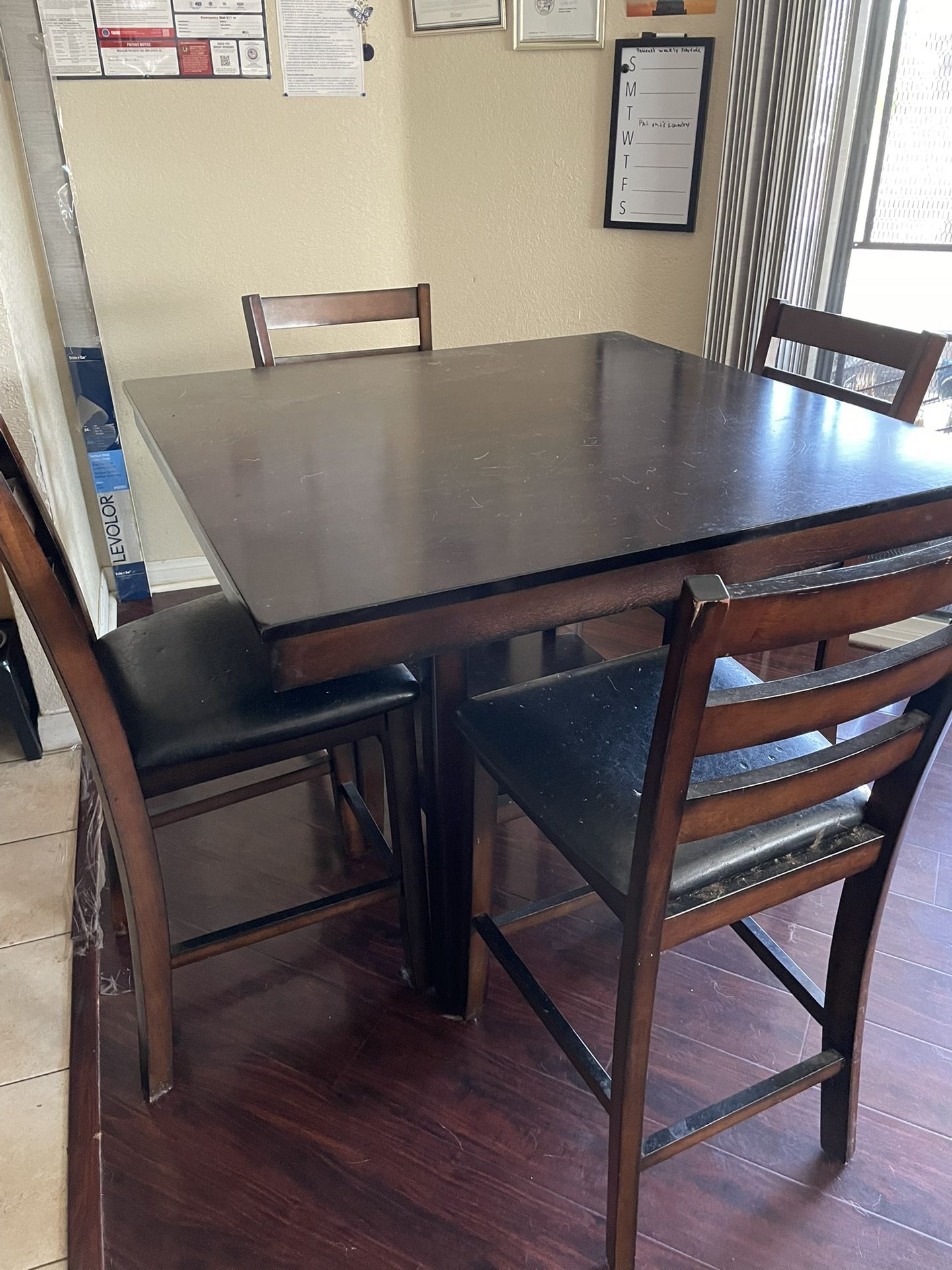 Brown wood dinning table with 4chairs In good condition you’ll need to wipe down replace cushions selling for $100 bucks need gone before tomorrow