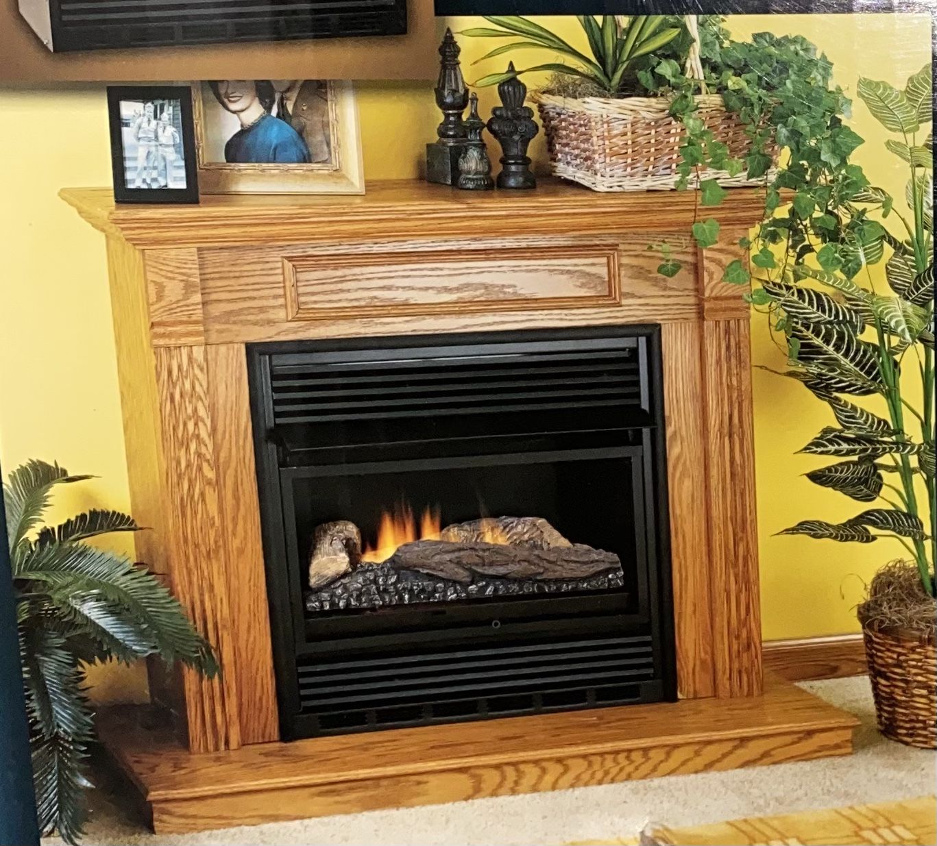 New Comfort Glow Gas Fireplace with Oak Cabinet Mantel