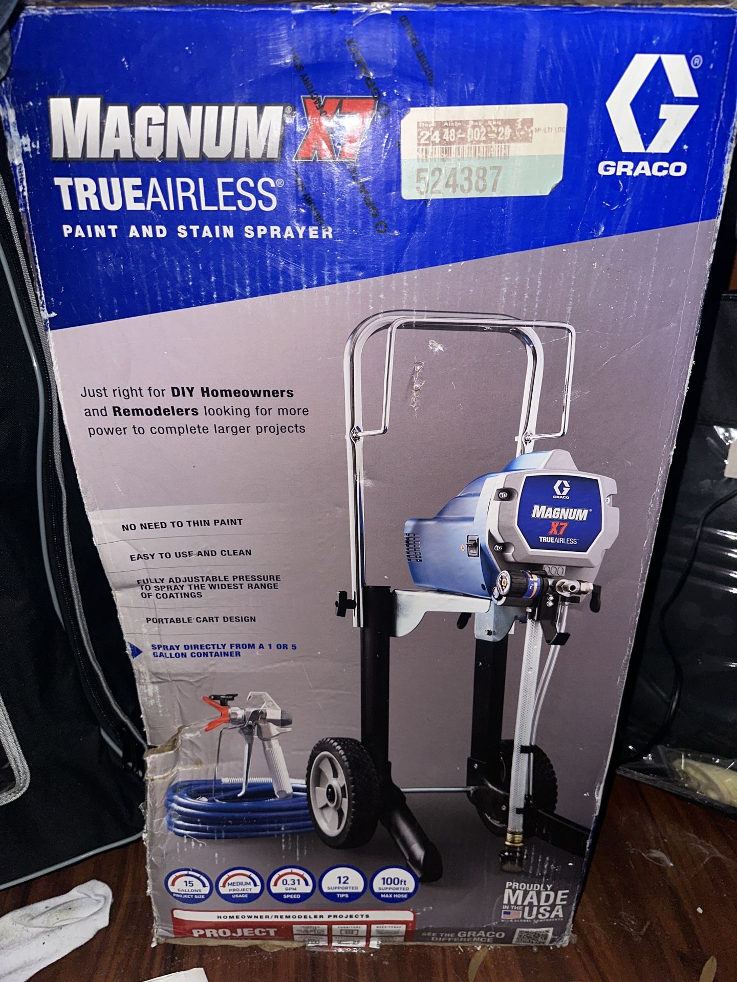 NEW IN THE BOX! Never open or used! Suitable for large cabinet-painting projects with huge paint capacity Reversible nozzle eliminates time-consuming clog issues No bucket attachment; suction tube delivers paint to the sprayer Built-in carrying handle makes this sprayer easy to transport ___________________________________________________ DIY homeowners and handymen will save time and money with the Magnum X7 with built-in cart. Tackle any interior project, exterior houses, fences and decks. The X7 supports a larger tip size for spraying heavier coatings and the convenient cart makes any painting project faster and easier. OBO