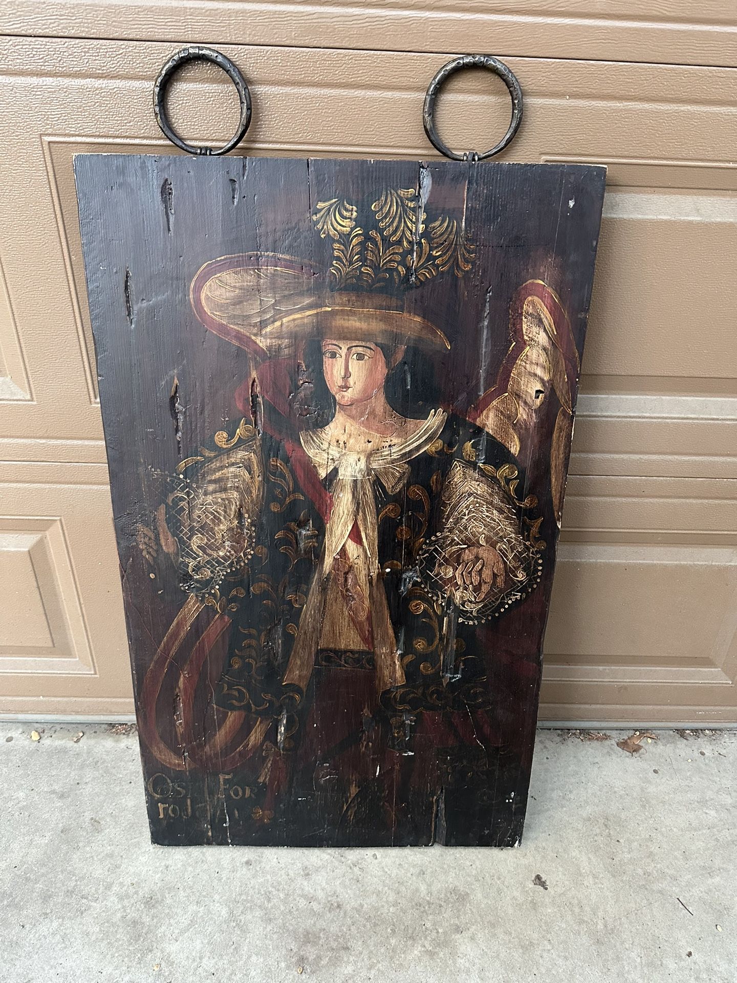 Vintage or possibly antique painting on wood with two metal rings on top. The painting is a Spanish Colonial-era artwork, possibly from the Cuzco School, which was an artistic tradition in Peru. It appears to be a painting of Gabriel the Archangel. It is located in - Main Street Antiques 208 E. Main Street Turlock, Ca. 95380 Ask for booth #18, there are two locations for 18 in this store. Price is $195.00 Plus Tax.