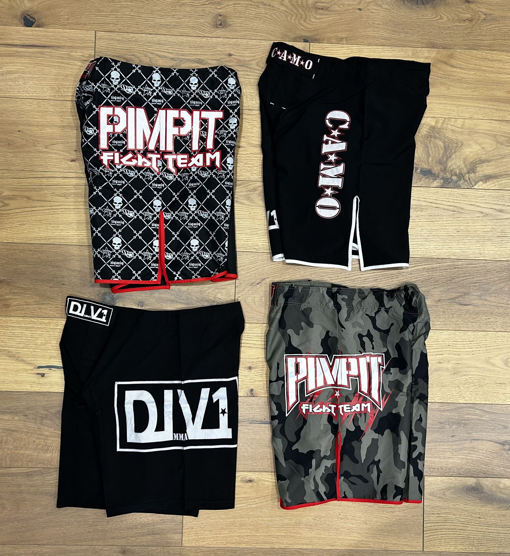 You get 4 individual new pairs of shorts with this purchase. We have waist 30, 32, 34, and 36. These can size down to 24 waist and up to 42 waist. Please let us know after you purchase what size you want for your 4 pairs of shorts. These retail for $45 per pair in stores. You get all 4 pairs for $36.95. PIMPIT FIGHT TEAM MMA Shorts. Worn by the best at every gym. Start your training in the best shorts made by fighters for fighters. Designed by actual UFC signed fighters. These had multiple updates and improvements made by the actual athletes on the mat and in the octagon. Invest in your future and ware a pair of shorts you feel confident in. Don’t be cheap and waste your money on the Chinese garbage that last a few workouts. Made from Kevlar polyester. These are very light and will provide the flexibility and strength you deserve. 6 inch side seam, 3 way Velcro closure, triple looped and re-enforced drawstring enclosure. You can size up 2 sizes and down 6 sizes for cutting weight. Designed in California in Costa Mesa with the guys you watch on ESPN. This team and brand evolved from UFC 48 and have had 1000’s of fighters around the world train and bang in these shorts. From UFC, WEC, ELITE XC, SHOW XC, CAGE RAGE, AFFLICTION, BELATOR, NBC WORKD CHAMPIONSHIPS OF FIGHTING, KING OF THE CAGE, and 100’s of other regional fight organizations. Only 50 units produced in this limited production run. FIGHT SHORTS JIUJITSU Grappling Muay Thai Shorts KICKBOXING UFC FIGHT. BADBOY, century, triumph, Gracie barra, venom, beltaor, gym shorts, lulu, volcom, lost, mayhem, gamba, tamba