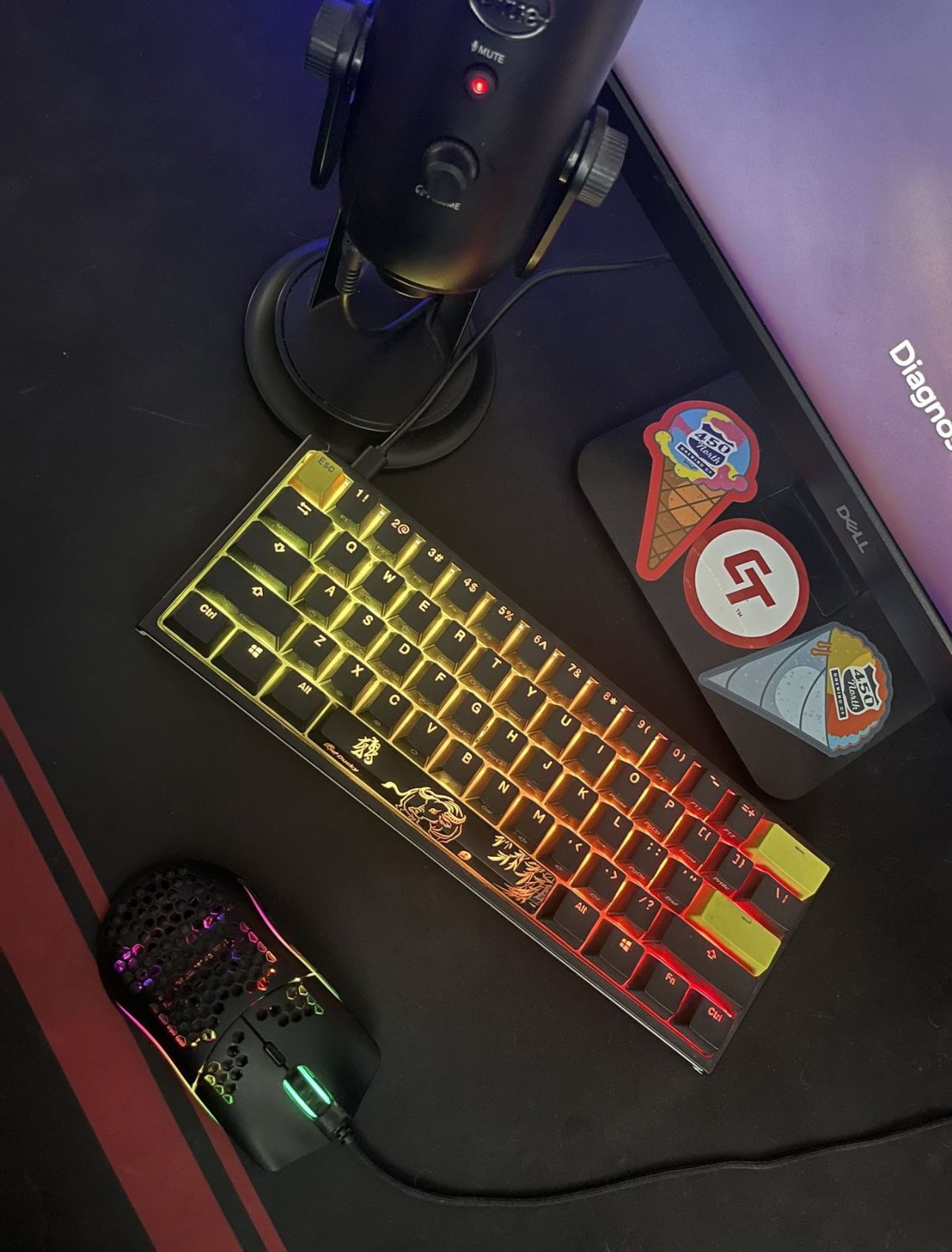 Ducky mecha mini 60% keyboard. Comes with extra keys. Black blue yeti microphone. Glorious model o mouse. Wired. Need gone asap. No trades! Monitor not included!