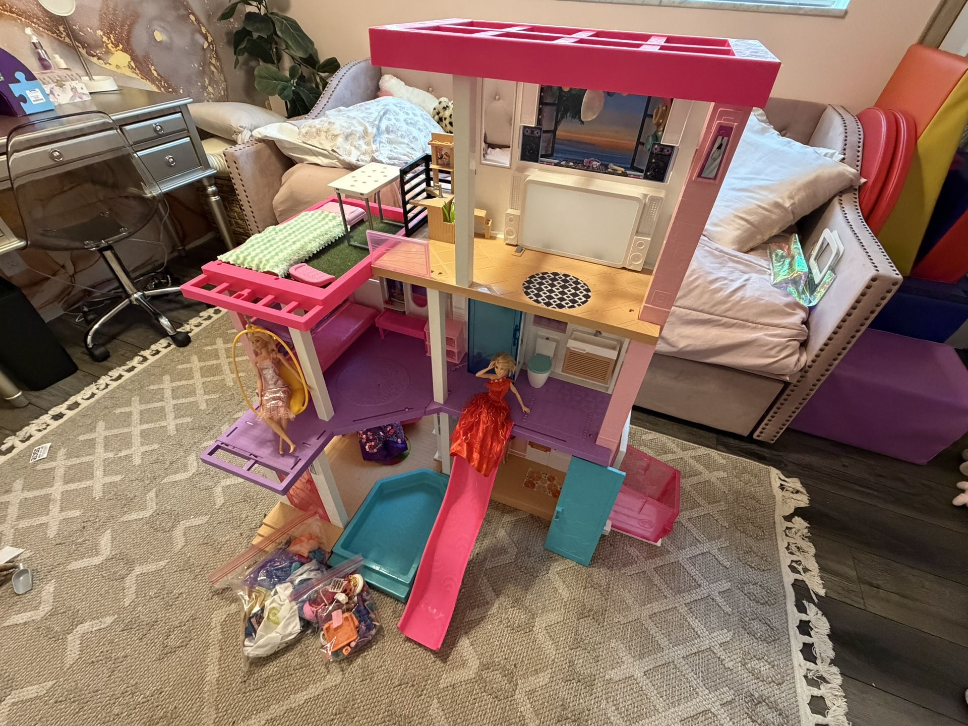 Barbie dream house with Barbie’s and accessories. Perfect for a little girl! Normal wear and all electronics work!