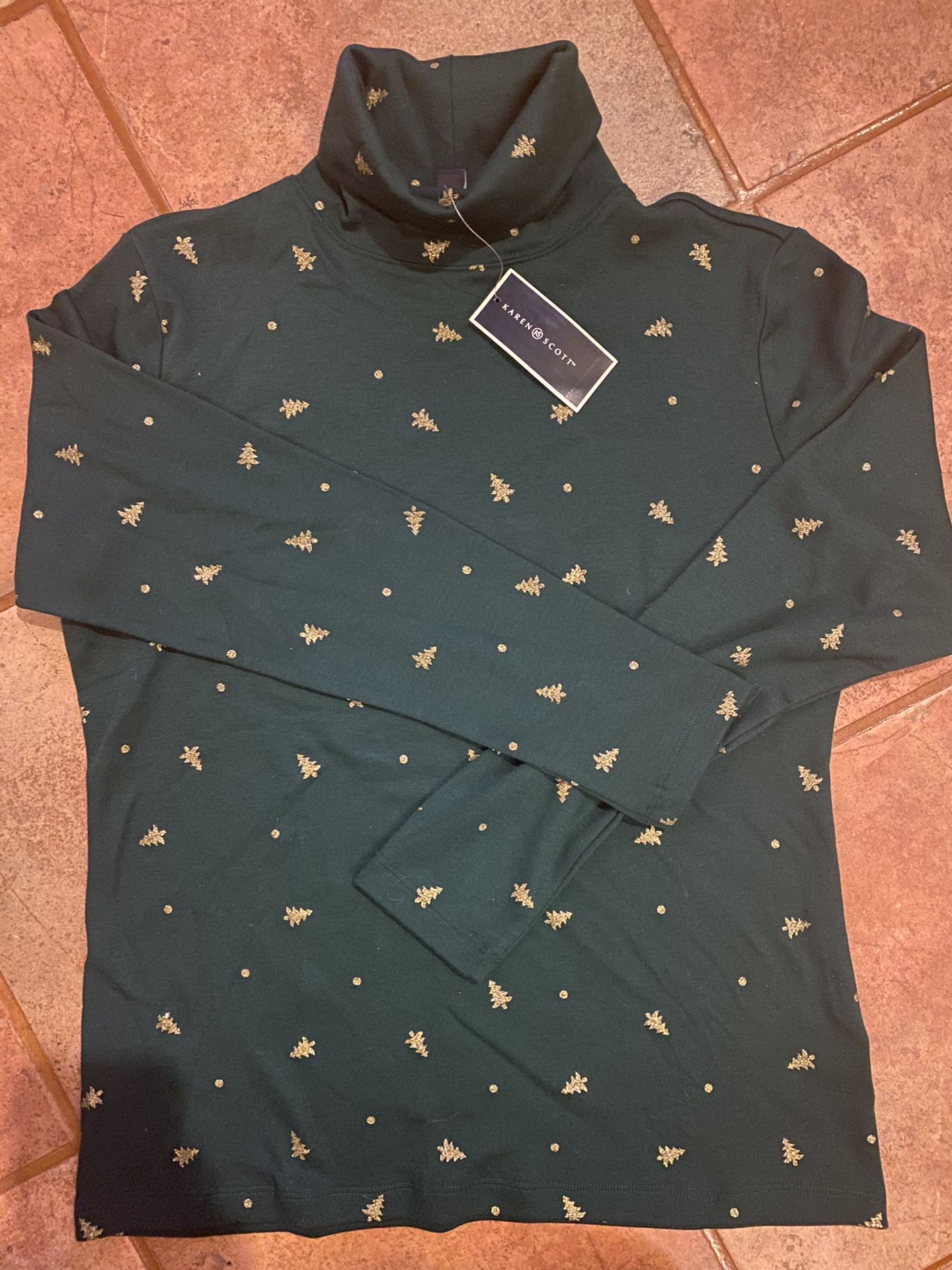 Super festive Christmas tree green turtleneck. All over sparkly gold trees. 60% cotton 40% polyester.