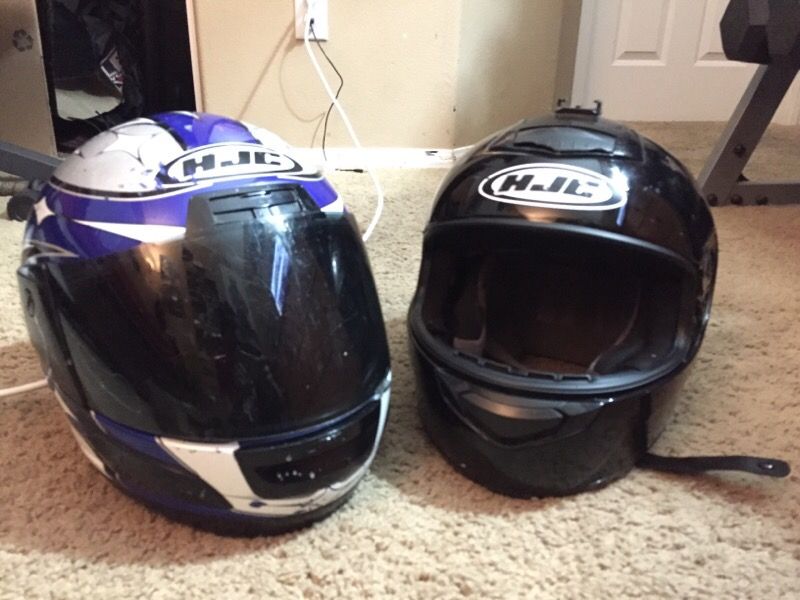 2 motorcycle helmets Black one doesn't have a visor, but easy to replace Blue one-$75 Black one-$50 Get both for $105