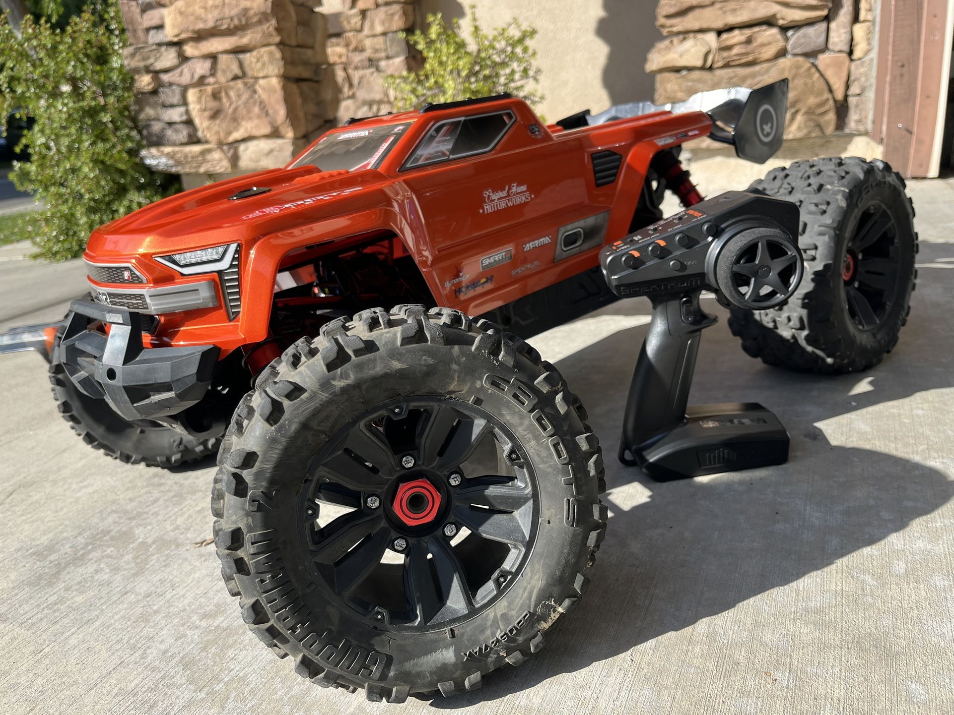 This is a Kraton 8s 1/5 scale stock electronics. A few mods mud guards carbon m2c and rear m2c. With stock dx3 avc. As you can see it has a new panted body that stands out. It will come with another body. This is just to big for me to play with on my street best offer maybe willing to trade for a new Kraton 6s EXB nothing else I’m interested in at the moment. But mainly cash works best offer. Welcome for a test drive to ensure you’re happy with your trade or purchase. Thanks Ignore: Traxxas arrma rc truck Pokémon m1 spektrum losi Nike adidas Nike Kobe Jordan aromas brushless motor 2s 8s