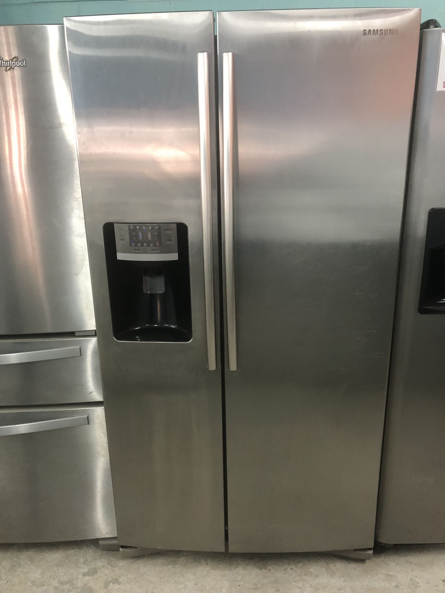 Samsung 26 cubic foot stainless side by side refrigerators with dispenser, 35 3/4” wide 68 1/2” high 32” deep. Food section has adjustable spill proof glass shelves deli draw 2 humidity controlled crispers gallon size door bins and new style LED lighting. Freezer side has 5 shelves 1 pull out basket and 4 door shelves. Refrigerator is plugged in and running. Comes with 120 day warranty. Financing and delivery available.