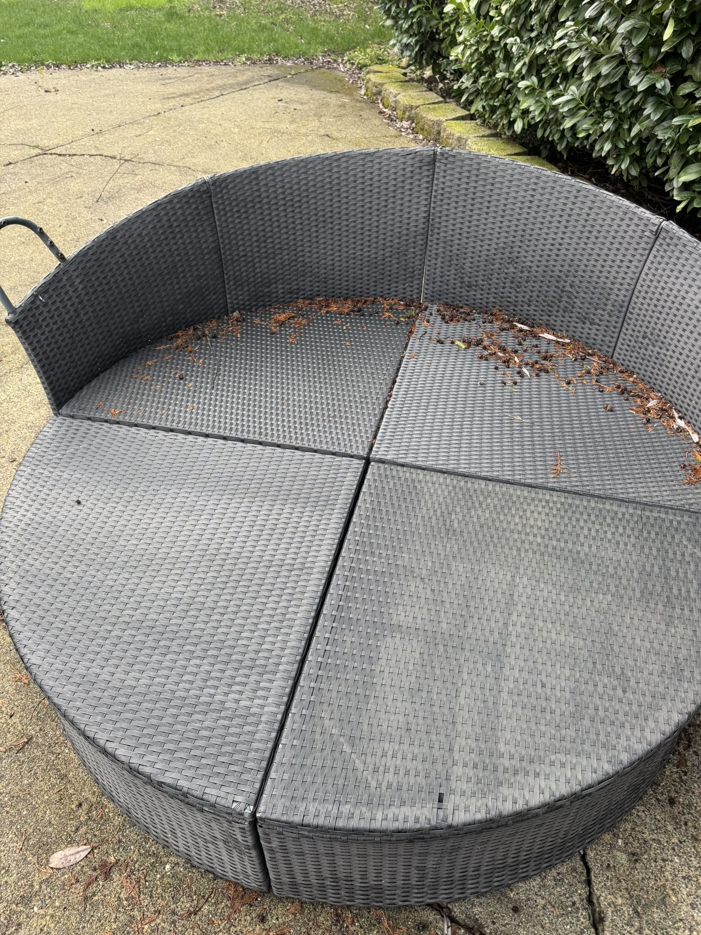 Very cool 6’ round outdoor sofa, splits in middle to be 2 seats, or pull it together to look fancy in front of your neighbors. No cushions come with this. It’s also missing one bracket on the ottoman piece. Doesn’t affect functionality but it can wobble when moving it. Probably $1 for 2 bolts and a bracket if you want to fix it.