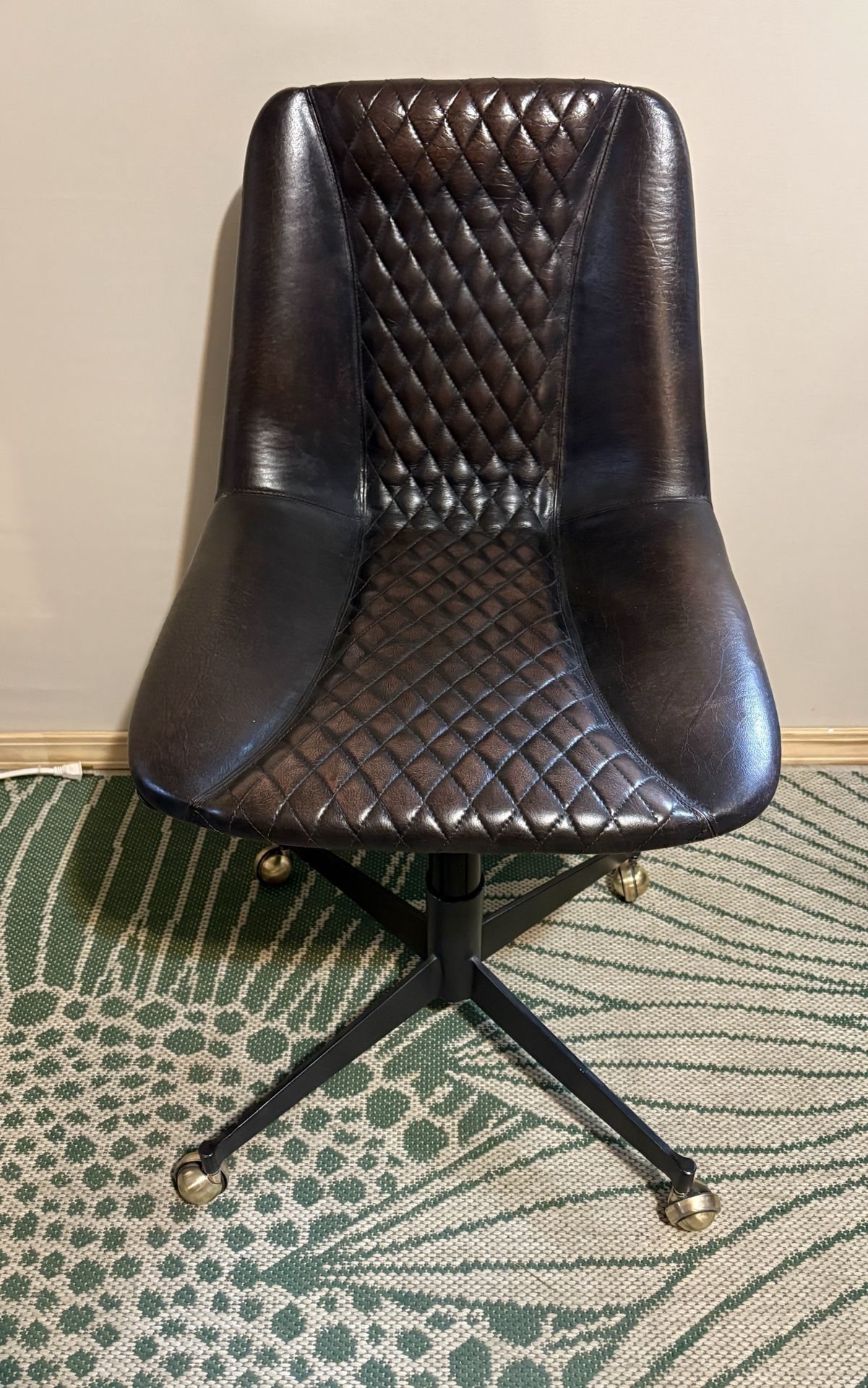 Beautiful genuine dark brown adjustable height quilted leather office chair with solid brass castors, glides easily, leather has been maintained with regular cleaning and conditioner. Seat measures 19”Wx16”D back height is 33” Pick up in Morton Grove 60053