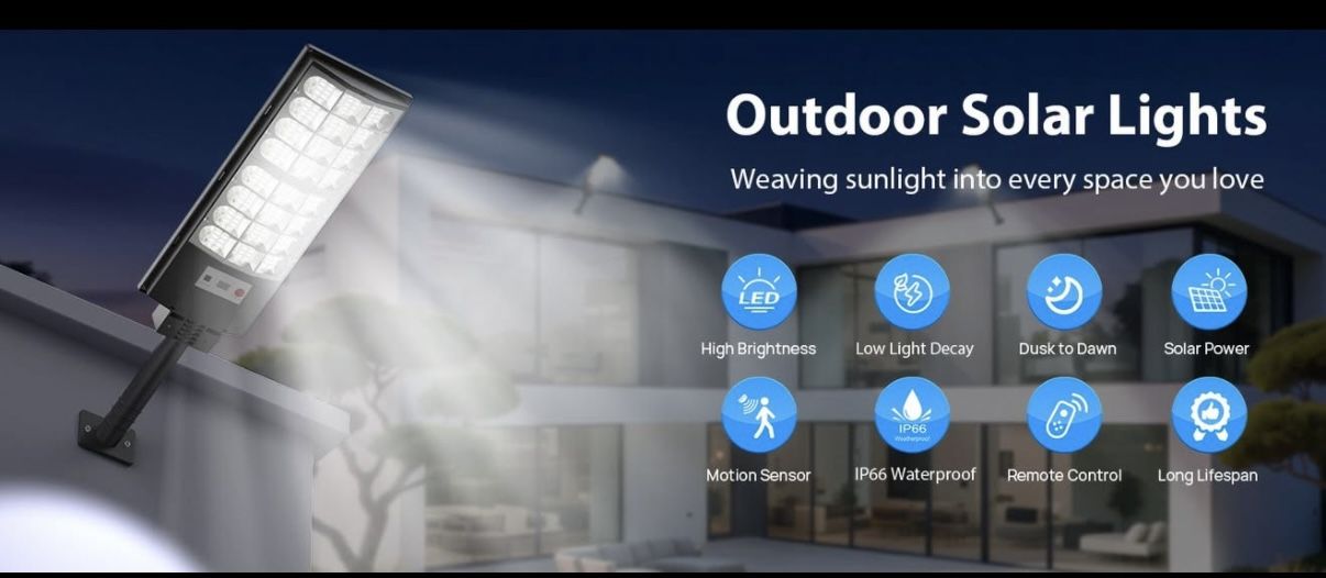 Brand new in box Solar Street Lights: 1000W solar light with 180 super-bright 5730 LED beads Charges during the day, lights for over 20 hours when fully charged. No electricity costs, auto on/off at dusk and dawn. Note: Do not look directly at LEDs when on.10000 Lumens Solar Motion Lights Outdoor: Includes remote control for long-distance use. Choose motion sensor, timer, or always-on mode, and adjust brightness from 20% to 100%. What's in the box solar lights Remote Control Mounting Hardware Set Instruction Manual