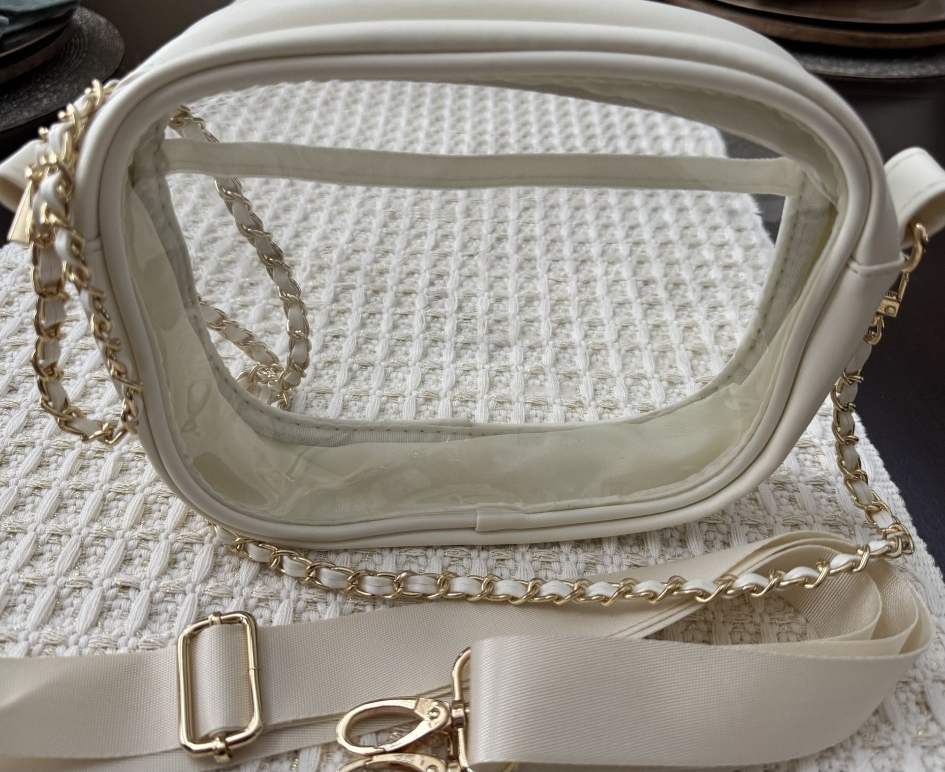 Off white clear stadium bag with gold and off white straps