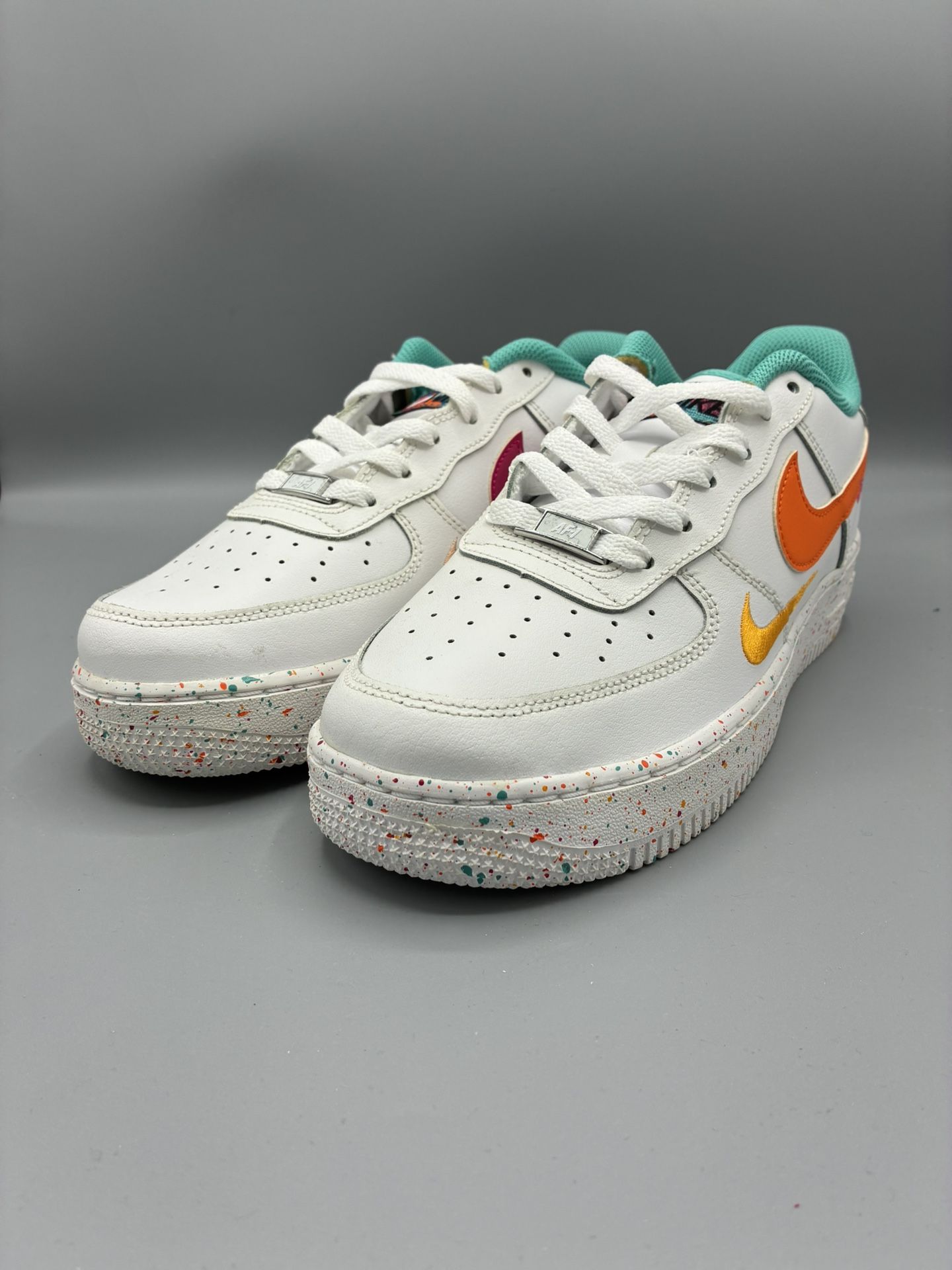 A crisp white base sets the tone—clean, breathable, and versatile. But this pair doesn’t stop at minimalism. Orange and yellow side accents bring warmth and motion, while turquoise lining and tongue details add a cool, refreshing contrast. The midsole is flecked with multicolored speckles, like confetti frozen midair—playful, expressive, and full of personality. Material & Build • Upper: Smooth synthetic with perforated panels for airflow and texture. • Lining & Tongue: Turquoise textile adds vibrancy and comfort. • Side Accents: Dual-tone orange and yellow emblem curves with motion. • Midsole: White rubber with multicolor speckles—artful and grounded. • Outsole: Clean and grippy, built for everyday movement. Design Language This silhouette blends athletic cues with artistic flair. The color placement feels intentional—like brushstrokes on a blank canvas. It’s a shoe that invites creativity, whether you’re styling it loud or keeping it chill. Fit & Flow Unisex by nature, with a low-cut profile that suits all foot types. Ideal for casual wear, light activity, or anyone who wants their footwear to speak in color.