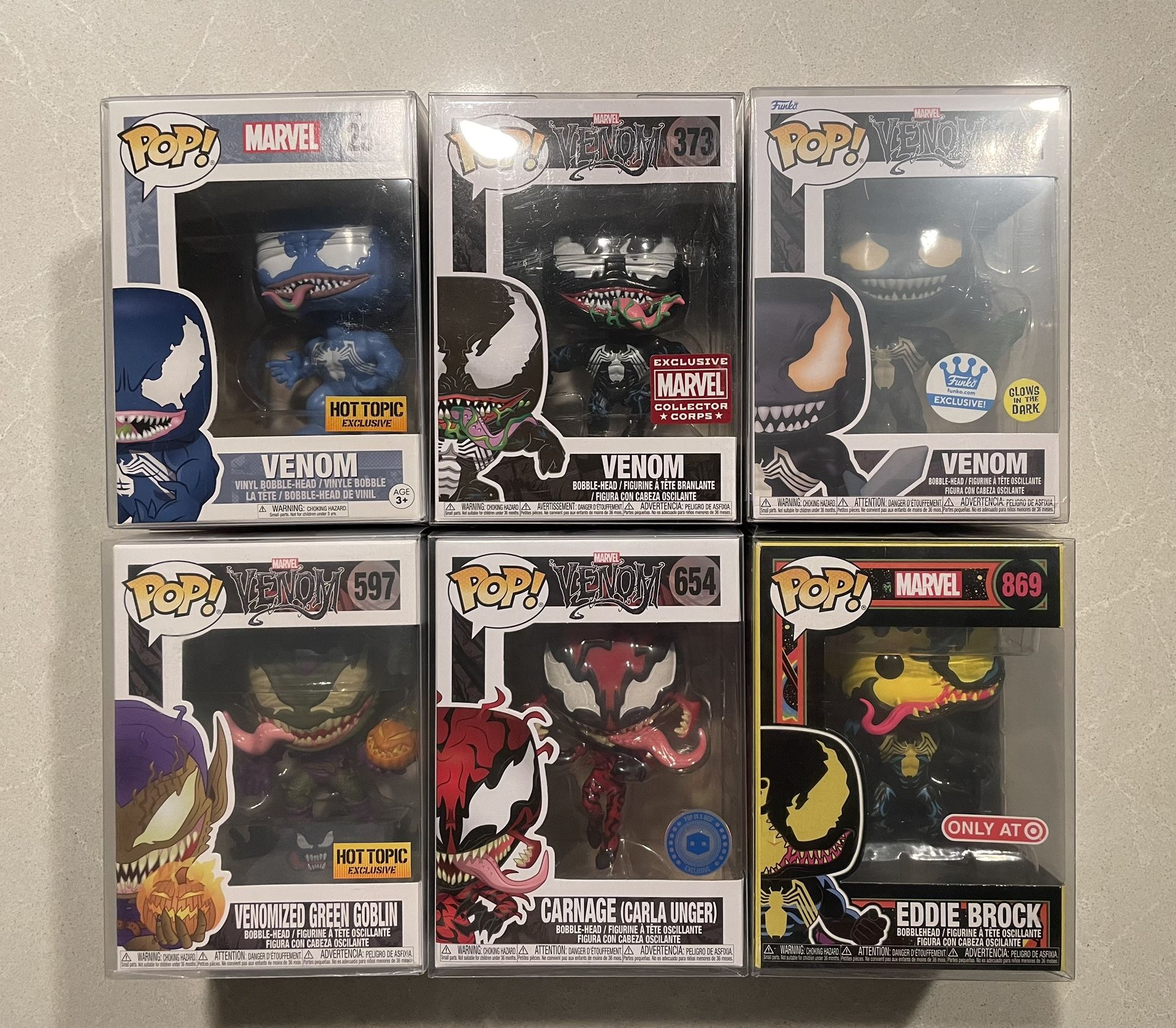 Includes FREE pop protector $100 Local pickup or ships same day Check profile for more Pops & collectibles Venom Funko Pop set: #234 - Blue Venom (Hot Topic Exclusive) #373 - Leaping Venom (MCC Exclusive) #1141 - GITD Venom w/ Sword & Mjolnir (Funko Shop Exclusive) #597 - Venomized Green Goblin (Hot Topic Exclusive) #654 - Carnage/Carla Unger (PIAB Exclusive) #869 - Blacklight Eddie Brock (Target Exclusive) Marvel Collector Corps Pop in a Box