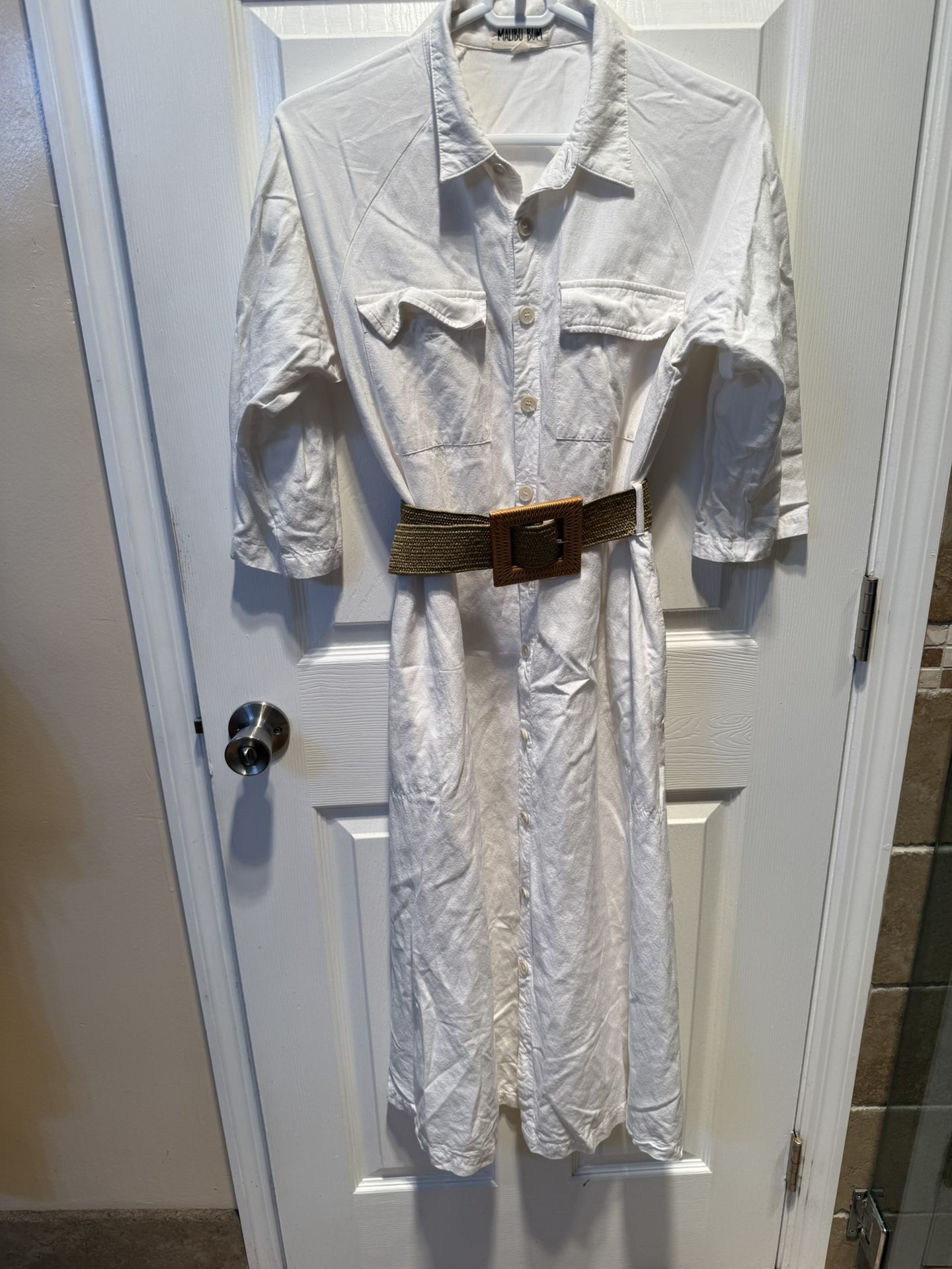 Elegant cream shirt dress featuring a stylish brown belt. Perfect for any occasion.